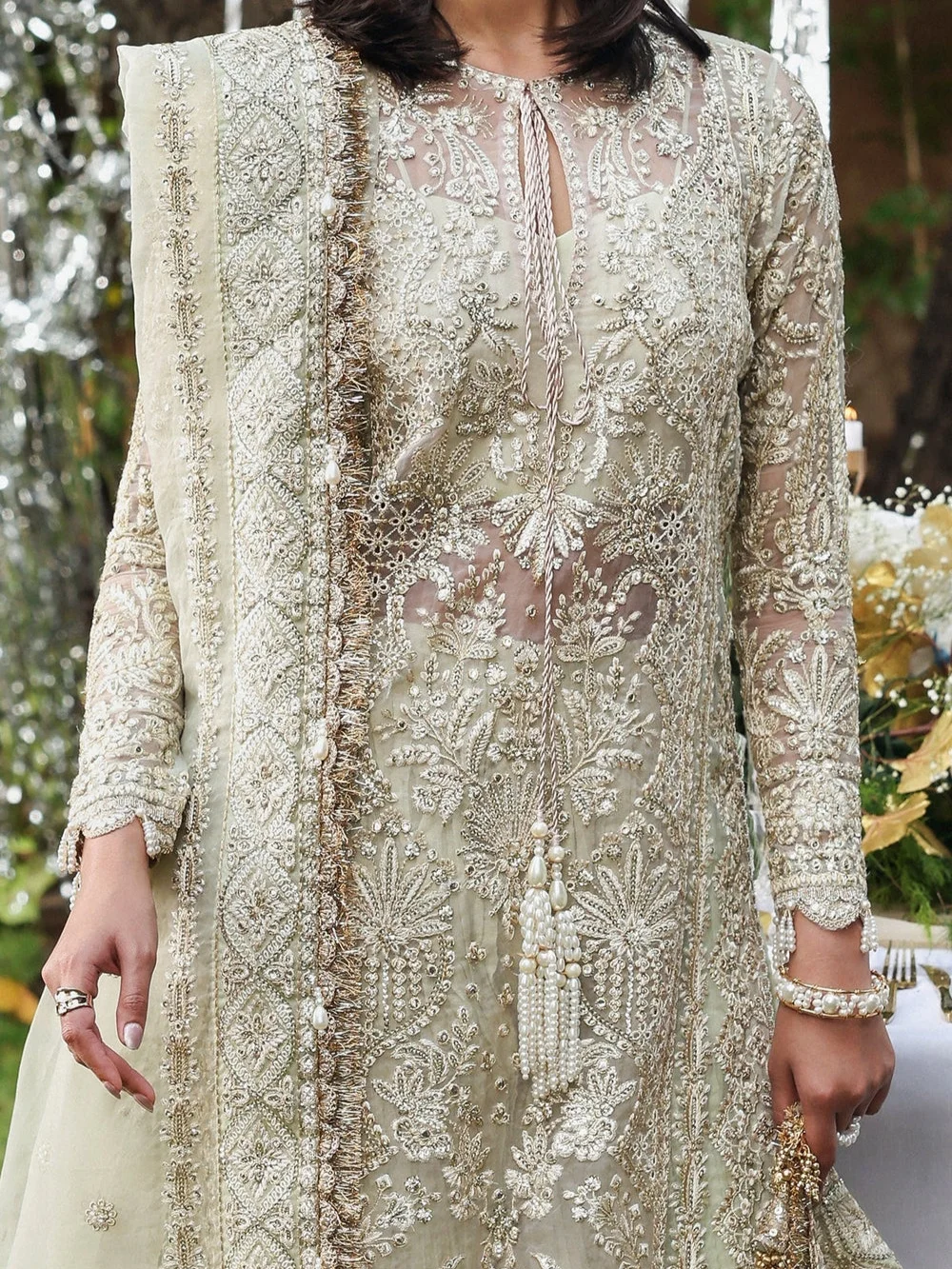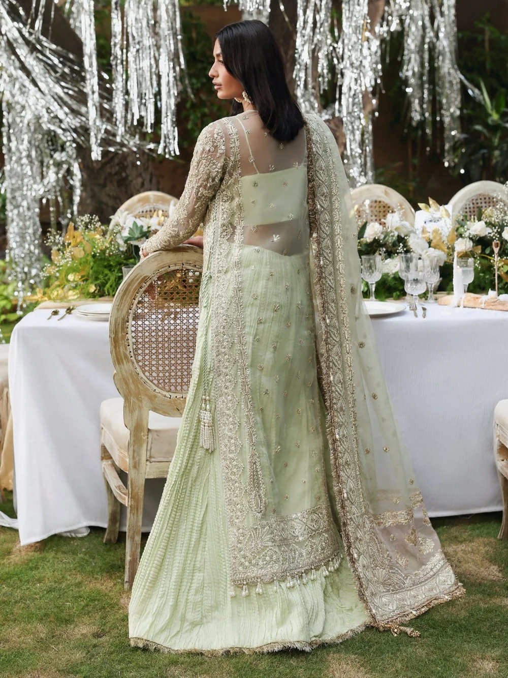 An opulent sage-toned organza long shirt, richly hand-embroidered with silver and champagne-hued threadwork, sequins, and intricate zardozi detailing that evoke timeless artistry. The silhouette, elongated and refined, is paired with a lightly layered lehenga for subtle volume and movement. A sheer organza dupatta, delicately bordered with glistening embellishments and tassel edging, completes the ensemble with an air of ethereal elegance. Perfectly balancing grandeur and grace, this look is made for festive soirées and unforgettable moments.