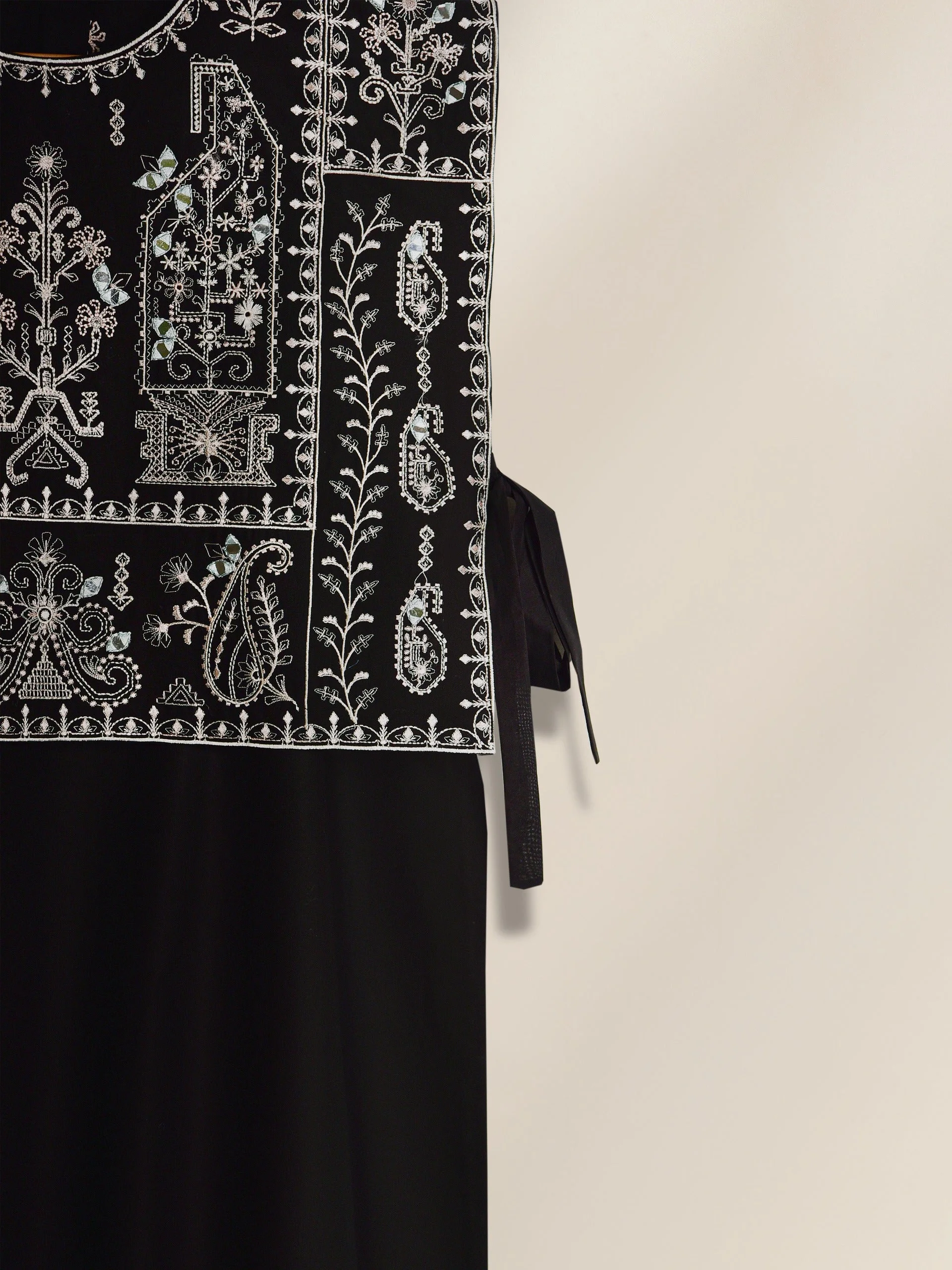 This elegant black dress features intricate white embroidery on the bodice, creating a stunning contrast that highlights traditional craftsmanship. The sleeveless design and flowing silhouette add a touch of modern simplicity, making it perfect for both casual and formal occasions.
