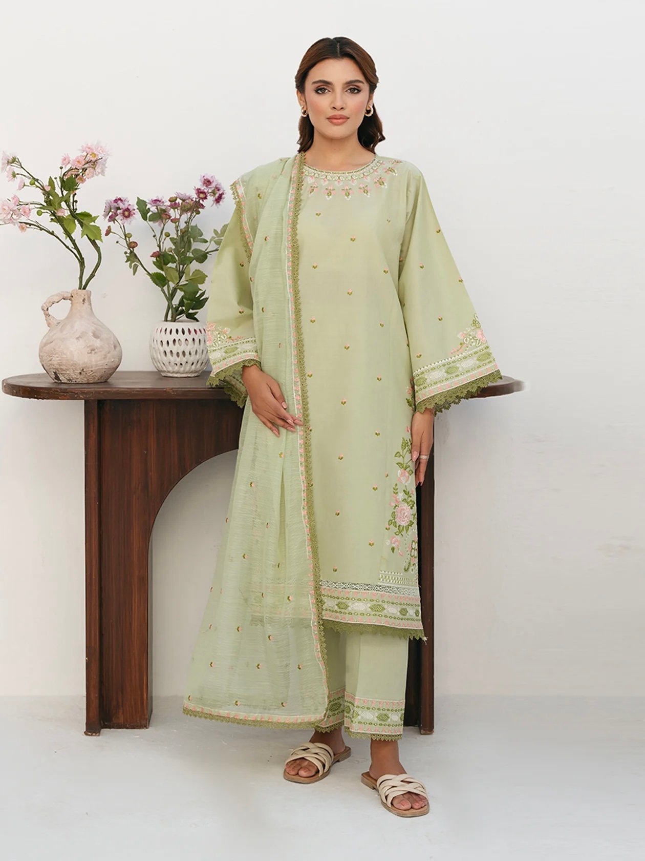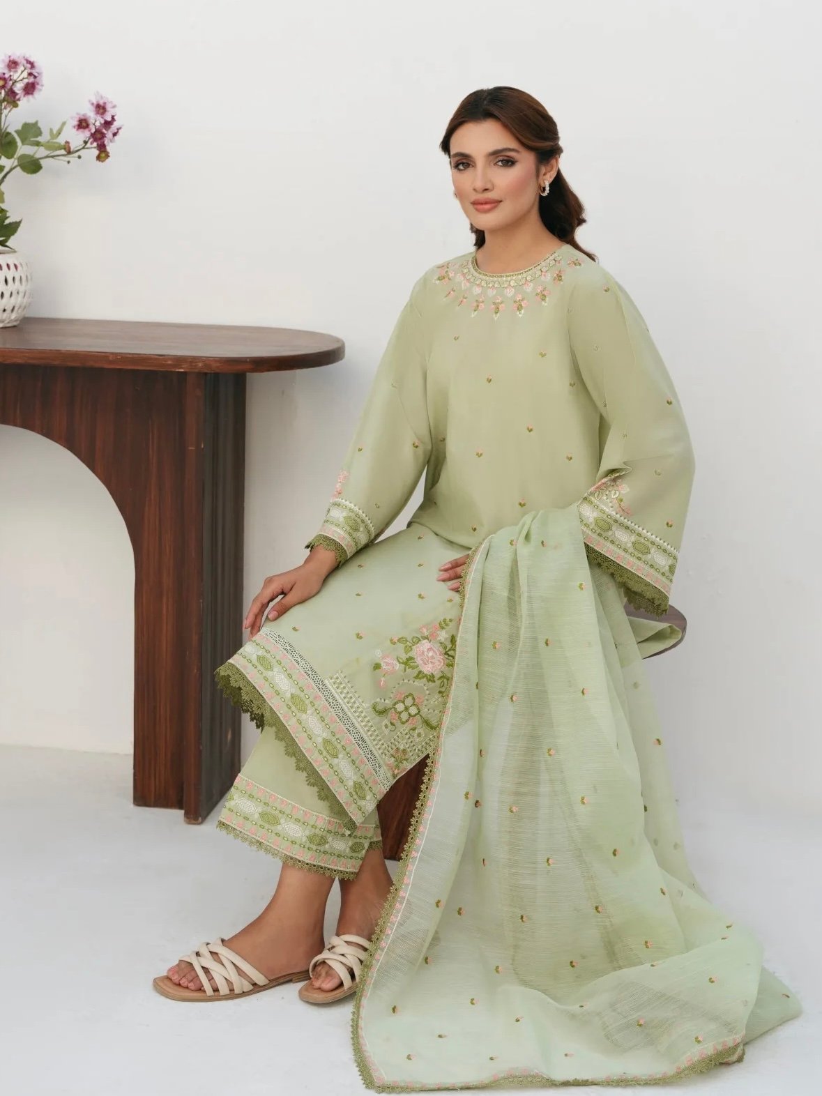 Embrace elegance in this lawn dress, featuring delicate floral embroidery and timeless craftsmanship. Crafted from finest of fabrics, it’s paired with embroidered trouser and a stunning embroidered dupatta adorned with laces, this ensemble offers the perfect blend of comfort and luxury.
