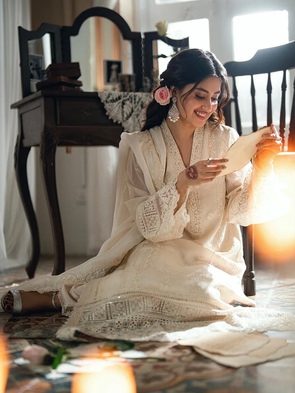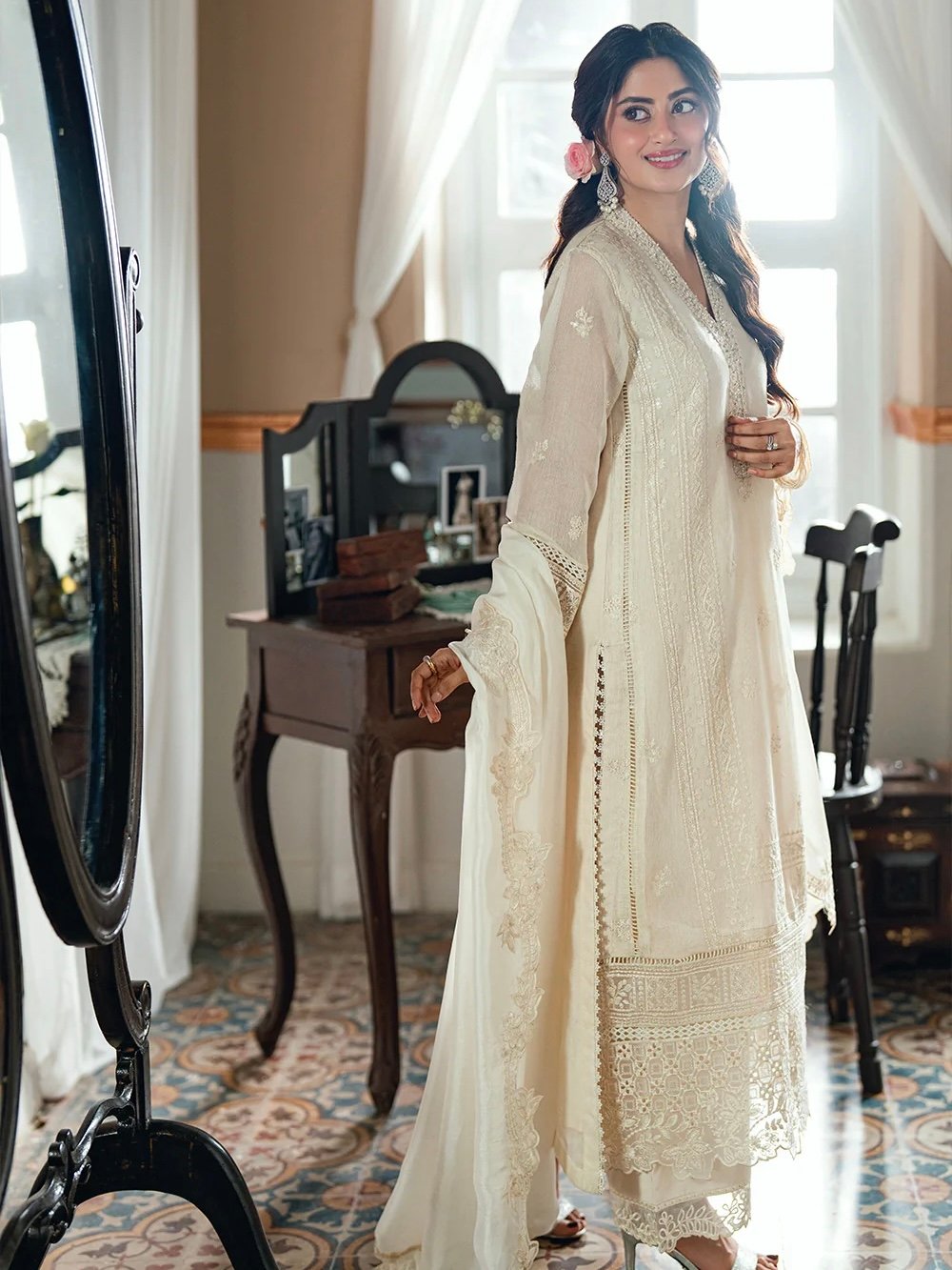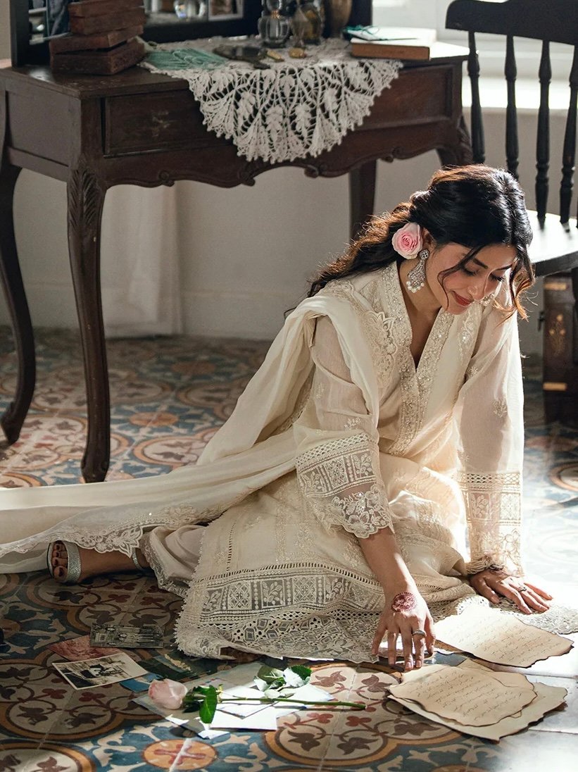 Ivory Petal is an ivory khaddi net, with cotton silk trouser & viscose silk dupatta, designed with understated elegance.