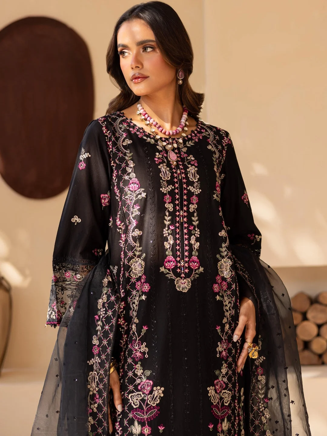 The fully embroidered black pima lawn paneled shirt is a masterpiece of intricate craftsmanship in multi color, showcasing a beautiful array of detailed stitching across each panel. The shirt is further enhanced with organza patches, adding texture and depth to its design, while delicate laces are used to finish the edges, lending a refined and elegant touch to the overall look.