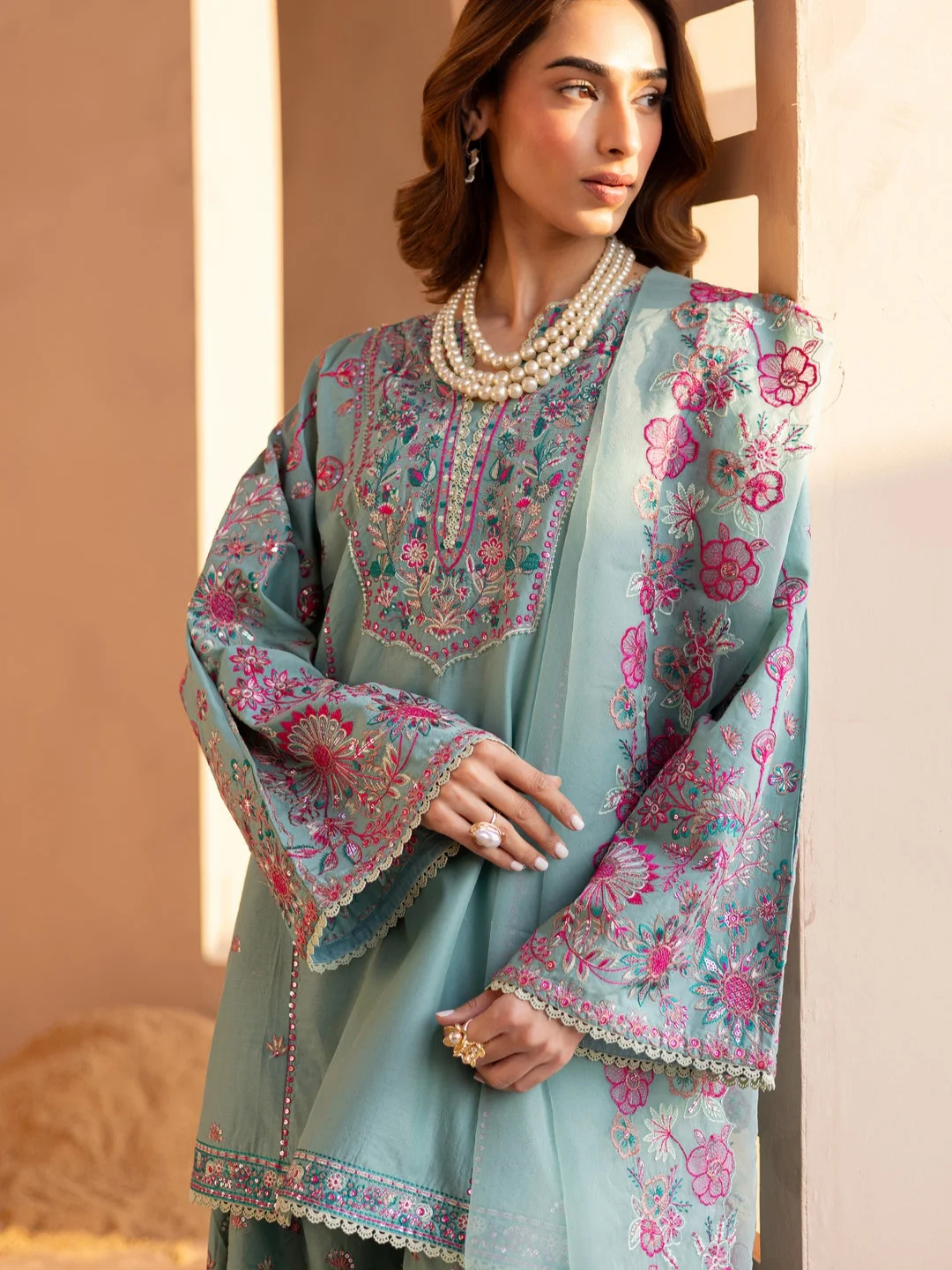 A contemporary take on classic elegance, this oil blue three-piece ensemble is designed with a structured yet stylish appeal. The short, box-fit paneled tunic is crafted from premium Pima Lawn and features square armhole sleeves with intricately composed embroidery. The adda work is applied to the center front panel. The neckline is beautifully adorned with pearl detailing, while the front, back, and side panels are enhanced with embroidered borders and bright-colored accents that add vibrancy to the look.