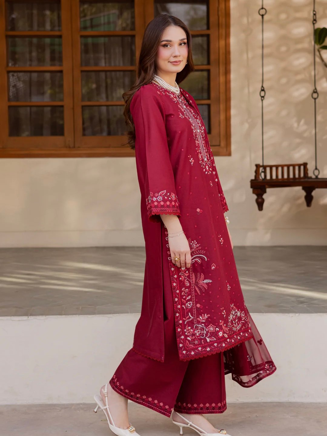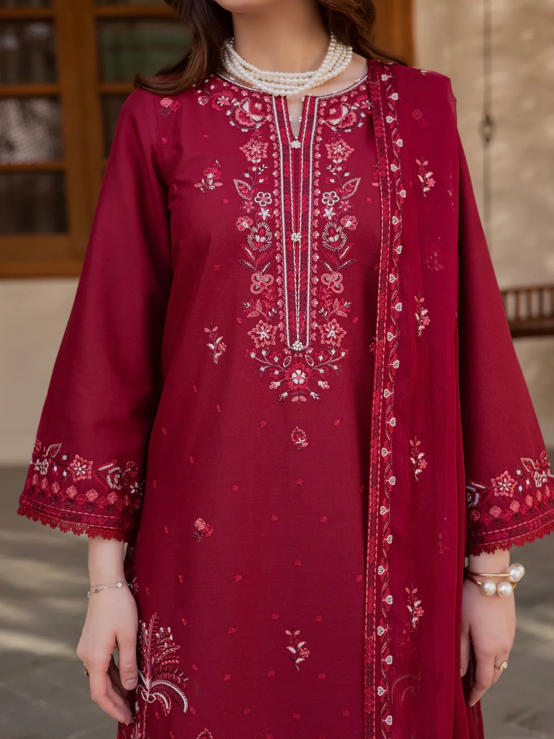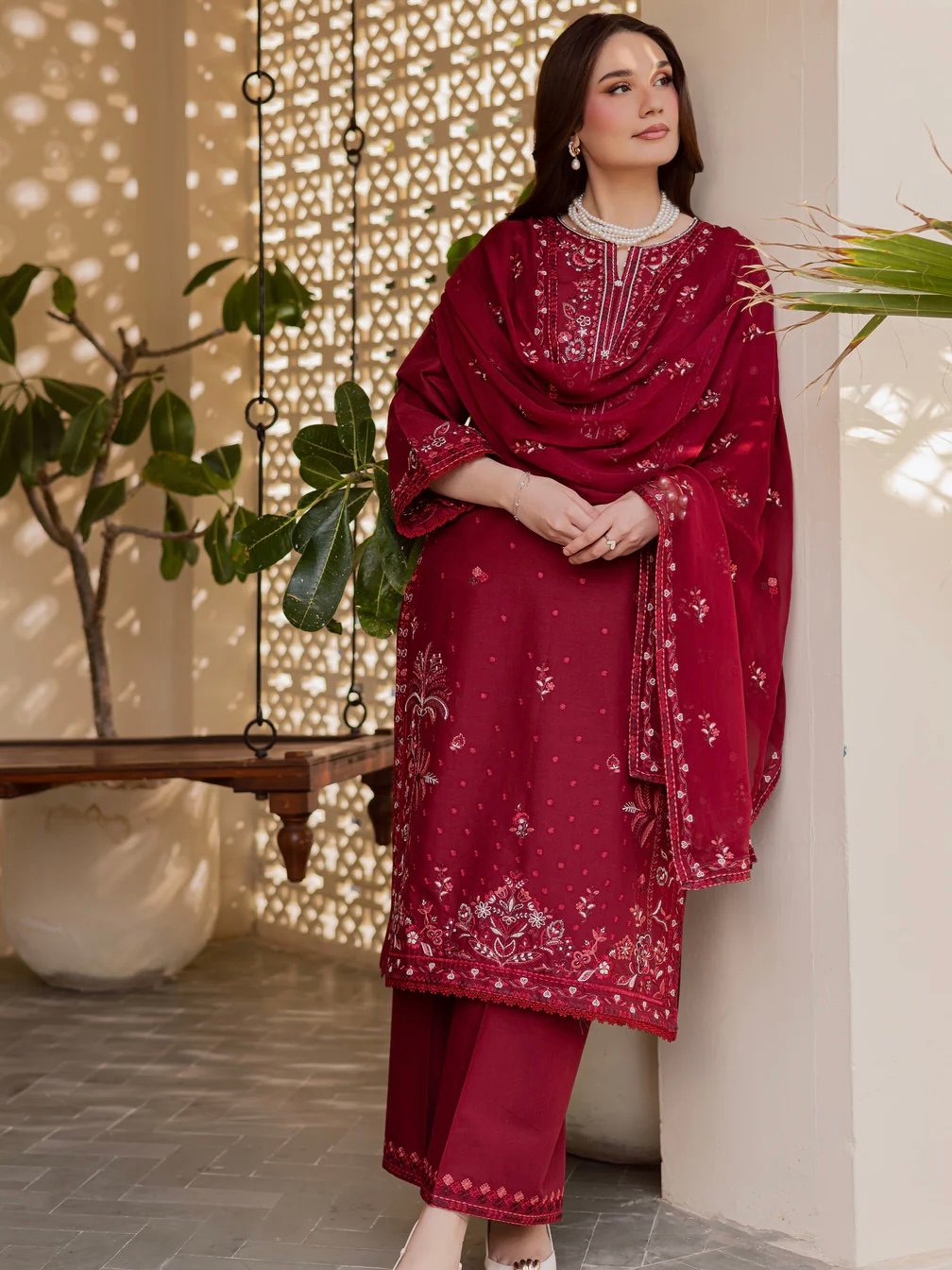 This three-piece set features a long fully embroidered khaddar shirt. The neckline is heavily embroidered, while the hem and sleeves are delicately finished with crochet lace.