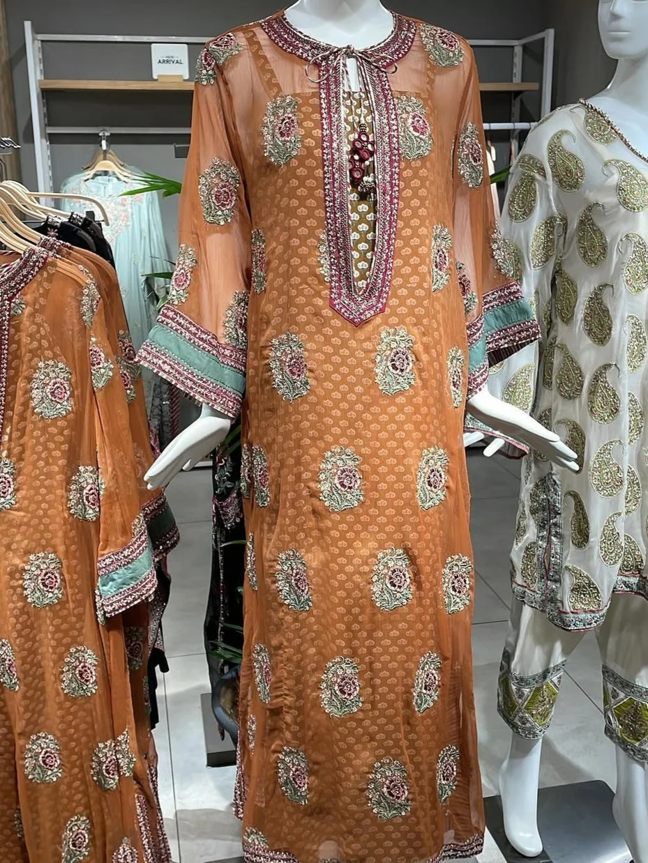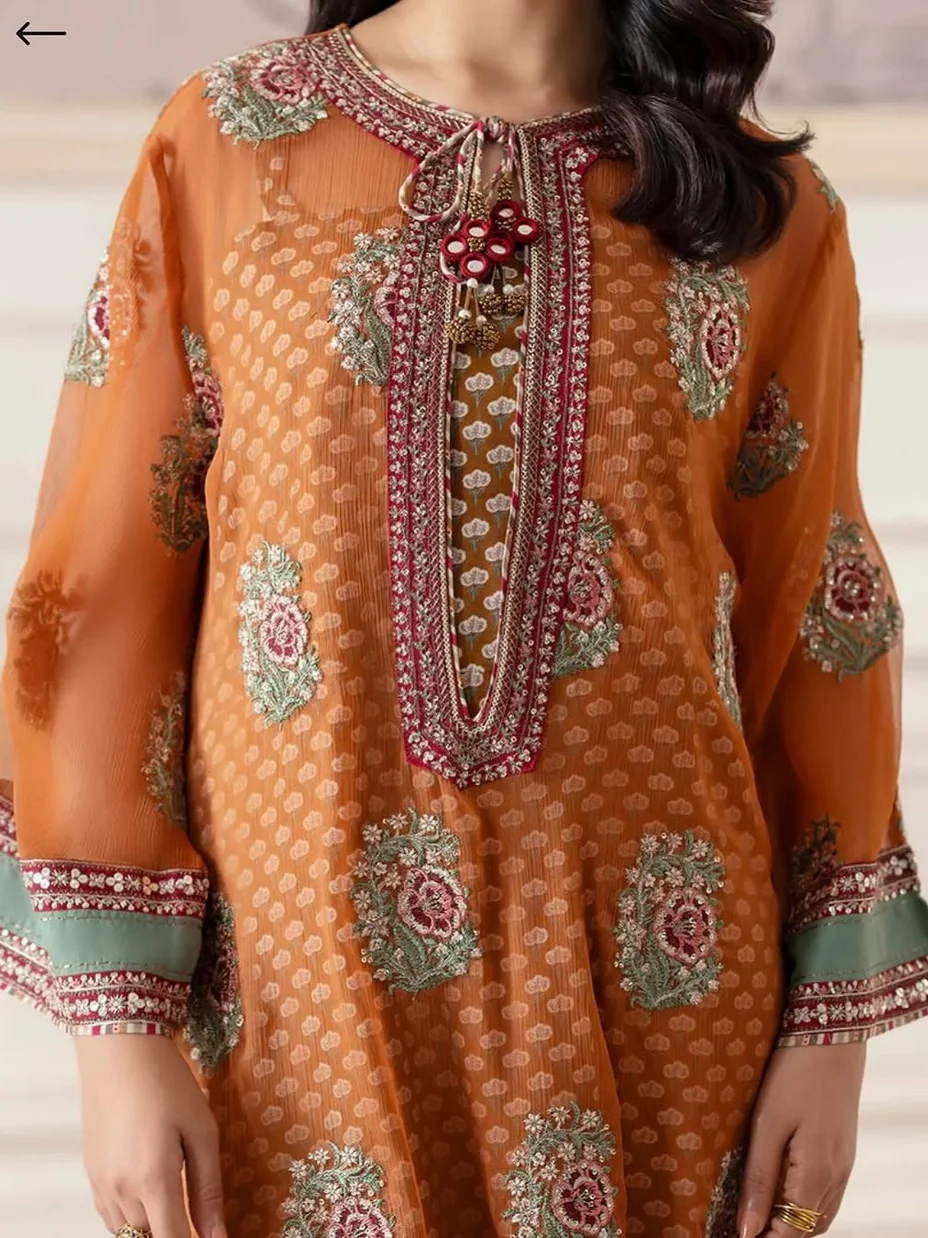 A classically chic composition is portrayed on this style statement outfit rendered in a vibrant orange shade. It features a contemporary chiffon shirt beautifully adorned with traditionally rich embroidery in mesmerizing colors and enhanced with delicate details. Paired with a printed inner slip adorned with captivating pattern. This scintillating outfit is a perfect option to look graceful this festive