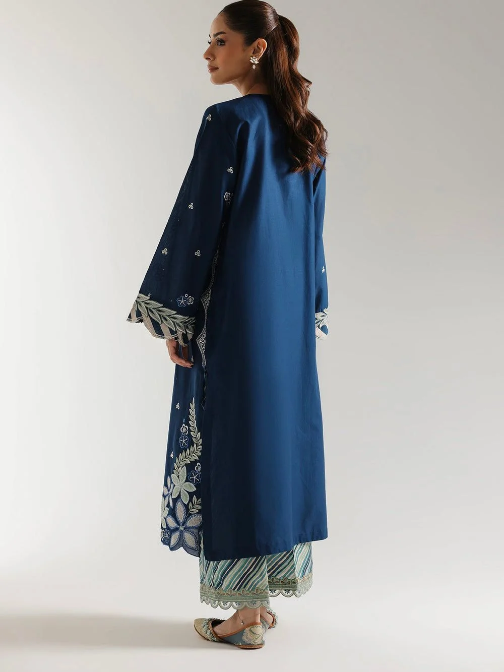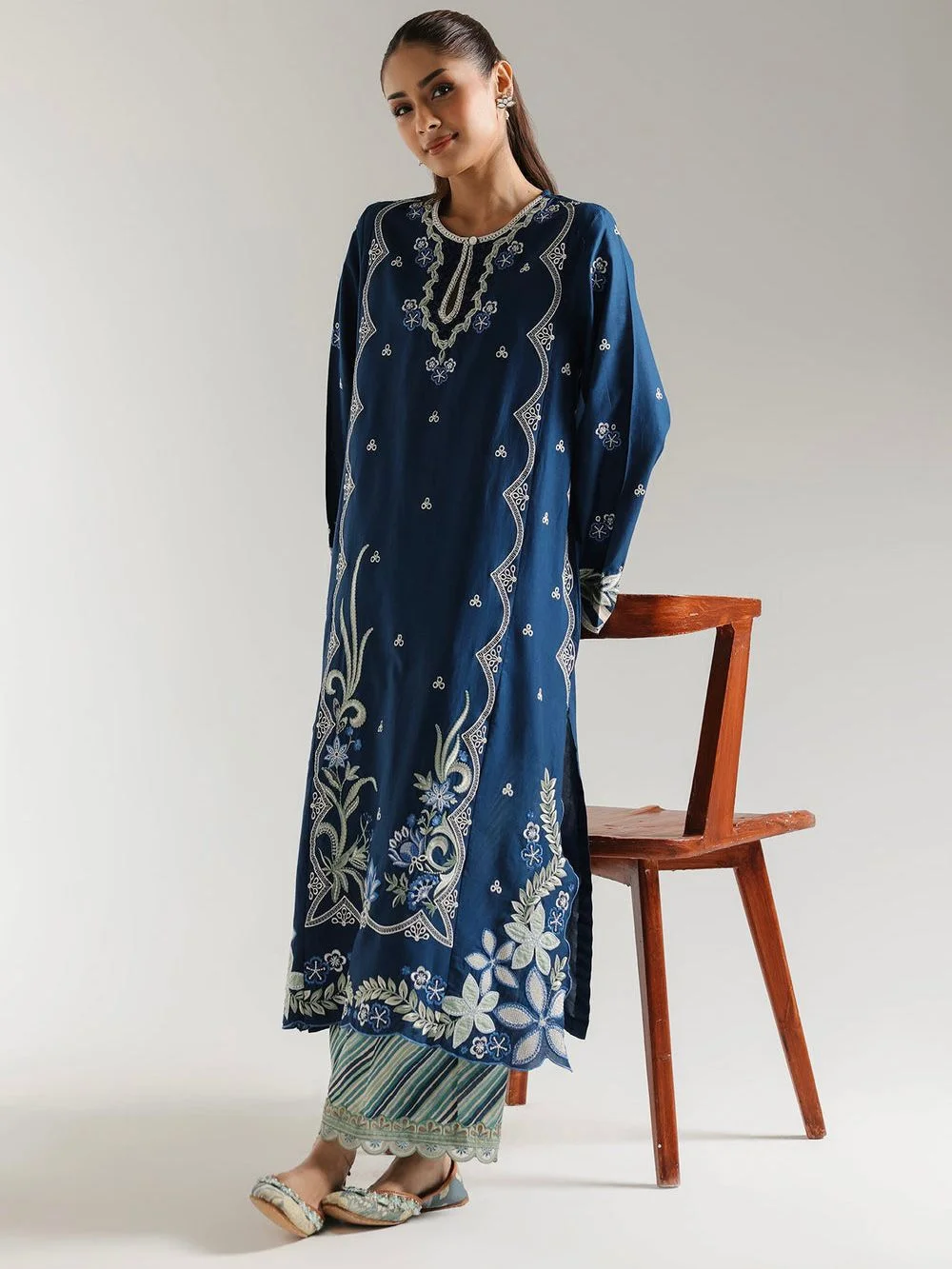Dive into Timeless Elegance. This captivating indigo blue ensemble is a masterpiece of intricate embroidery and sophisticated design. The long kurta, adorned with exquisite floral and paisley motifs in contrasting threadwork, speaks of heritage artistry. The detailed neckline and gracefully flared sleeves add a touch of regal charm. Paired with a beautifully patterned trouser that complements the rich embroidery. Make a statement that whispers of tradition and shouts of contemporary chic.