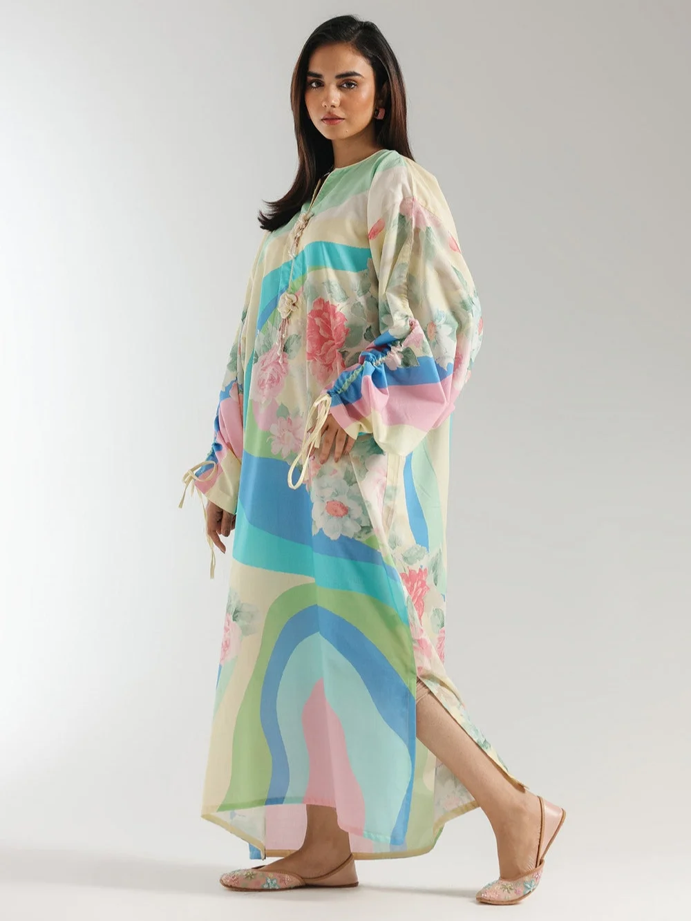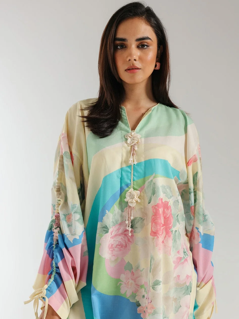 A contemporary composition is layered on this elegant elongated shirt crafted in a trendy silhouette with low side slits. Rendered in yellow beige color and beautifully adorned with fascinating floral prints illustrating artistic designs and enhanced with dazzling add ons at front neck. Style this graceful and statement outfit at happening events this season.