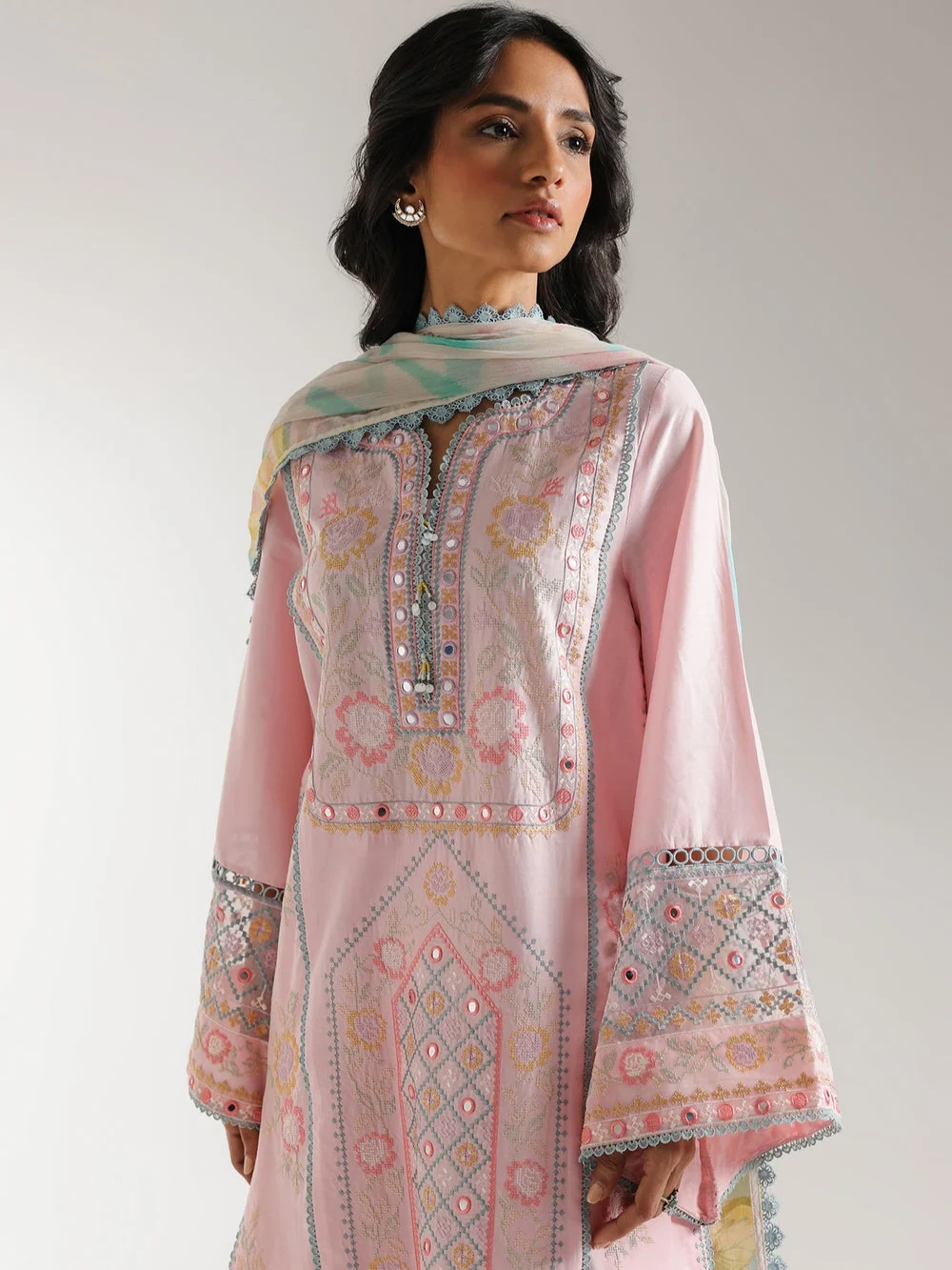 A classically chic composition is portrayed on this style statement outfit. It features a contemporary pink shirt illustrating attractive floral designs and beautifully adorned with traditionally rich embroidery in captivating colors. Paired with a graceful embroidered shalwar and an elegant flowing printed dupatta. A great addition to your summer season wardrobe.