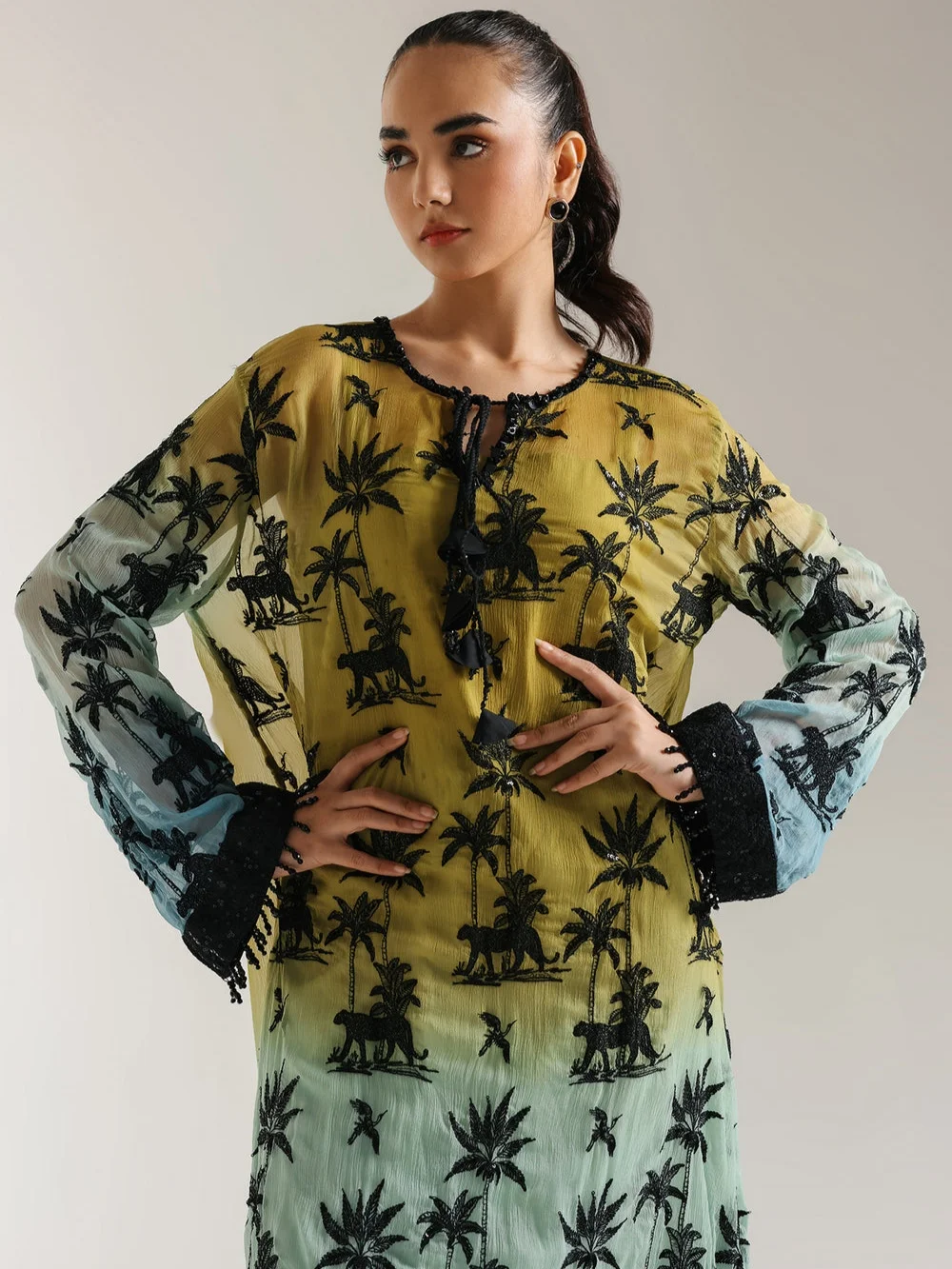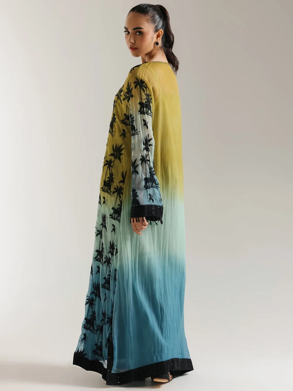 Escape to a tropical dream in this mesmerizing ombre kaftan. It flows in a gradient of golden yellow, soft turquoise, and deep blue, reminiscent of a sunset over the ocean. Silhouetted black palm trees create an exotic and captivating print. The long, wide sleeves and relaxed silhouette offer an ethereal and comfortable fit. A coordinating inner slip ensures a smooth drape. Embrace a touch of wanderlust and sophisticated style with this unique ensemble, perfect for special occasions or adding a touch of global chic to your wardrobe.