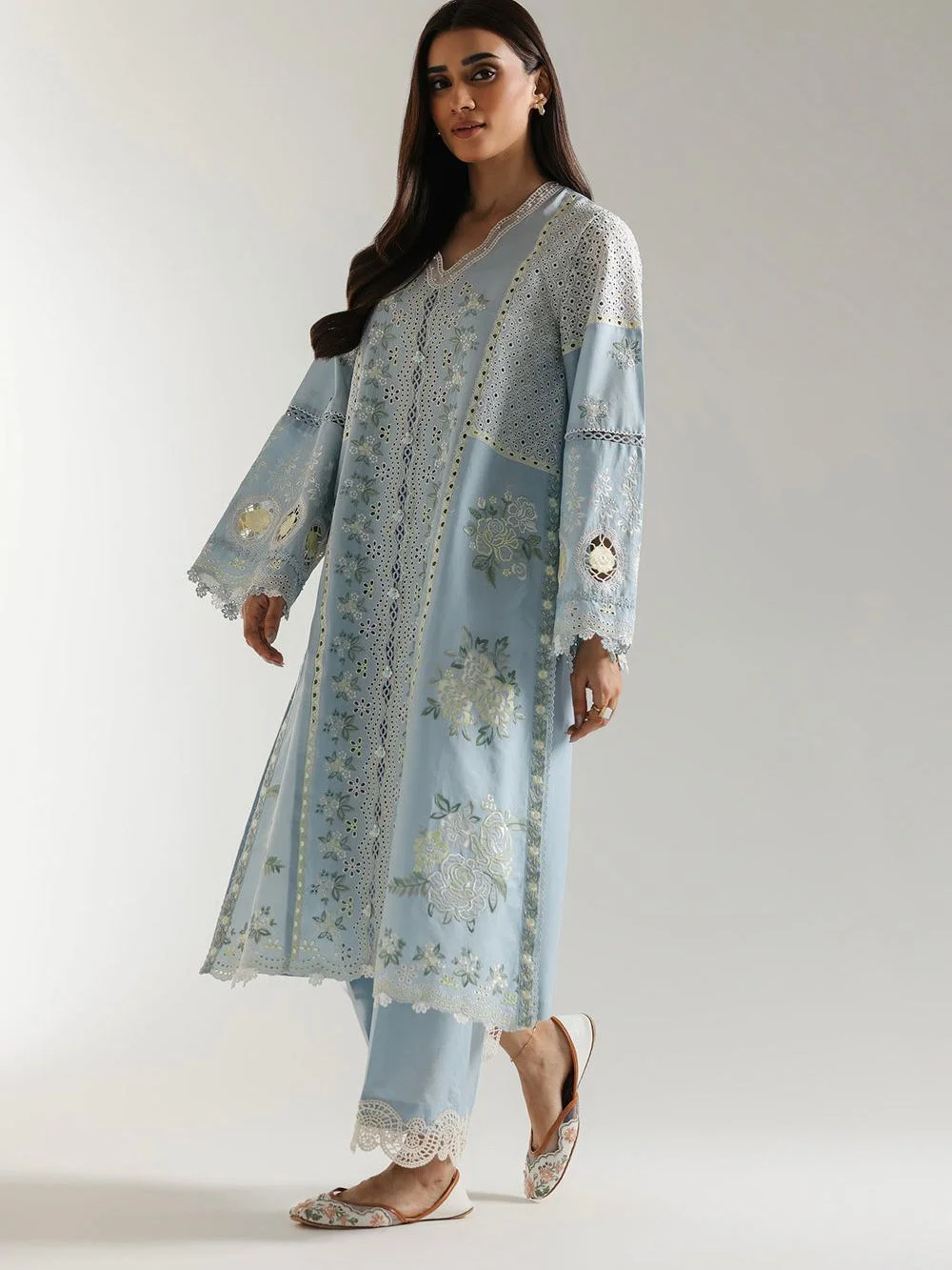 Emanate ethereal charm in this breathtaking light blue embroidered ensemble. The shirt features exquisite white embroidery in floral and geometric patterns that create a stunning contrast against the soft blue fabric. Intricate cut-work detailing, particularly along the V-neckline, full sleeves, and hem, adds an element of refined artistry. The sleeves are further adorned with beautiful white embroidery and intricate cut-work, featuring flared cuffs that enhance the graceful silhouette. The coordinating light blue trouser features matching white lace detailing along the hem, completing this harmonious and sophisticated look. Perfect for formal daytime events or elegant evening gatherings, this outfit is designed to leave a lasting impression of serene beauty and timeless style.