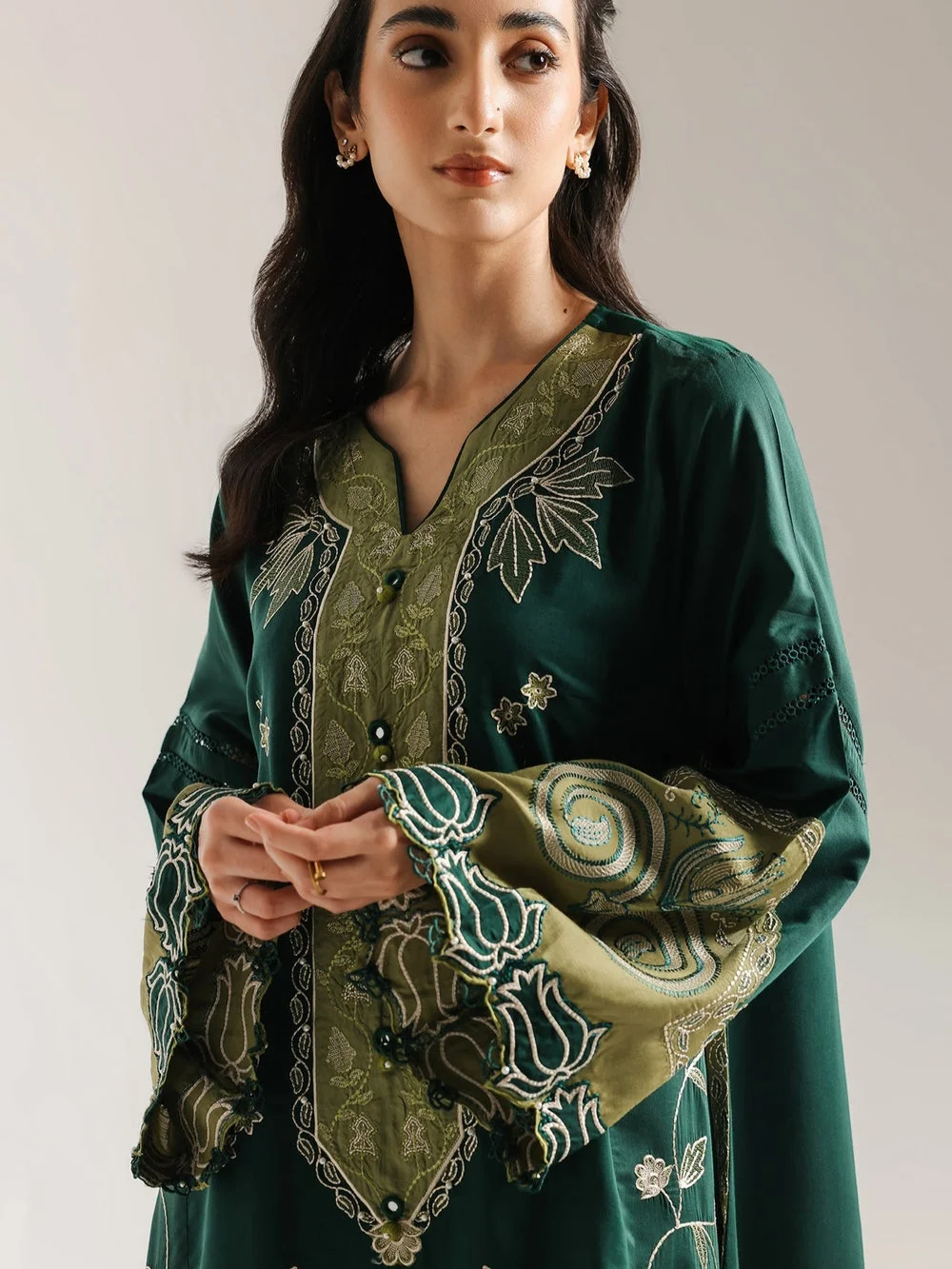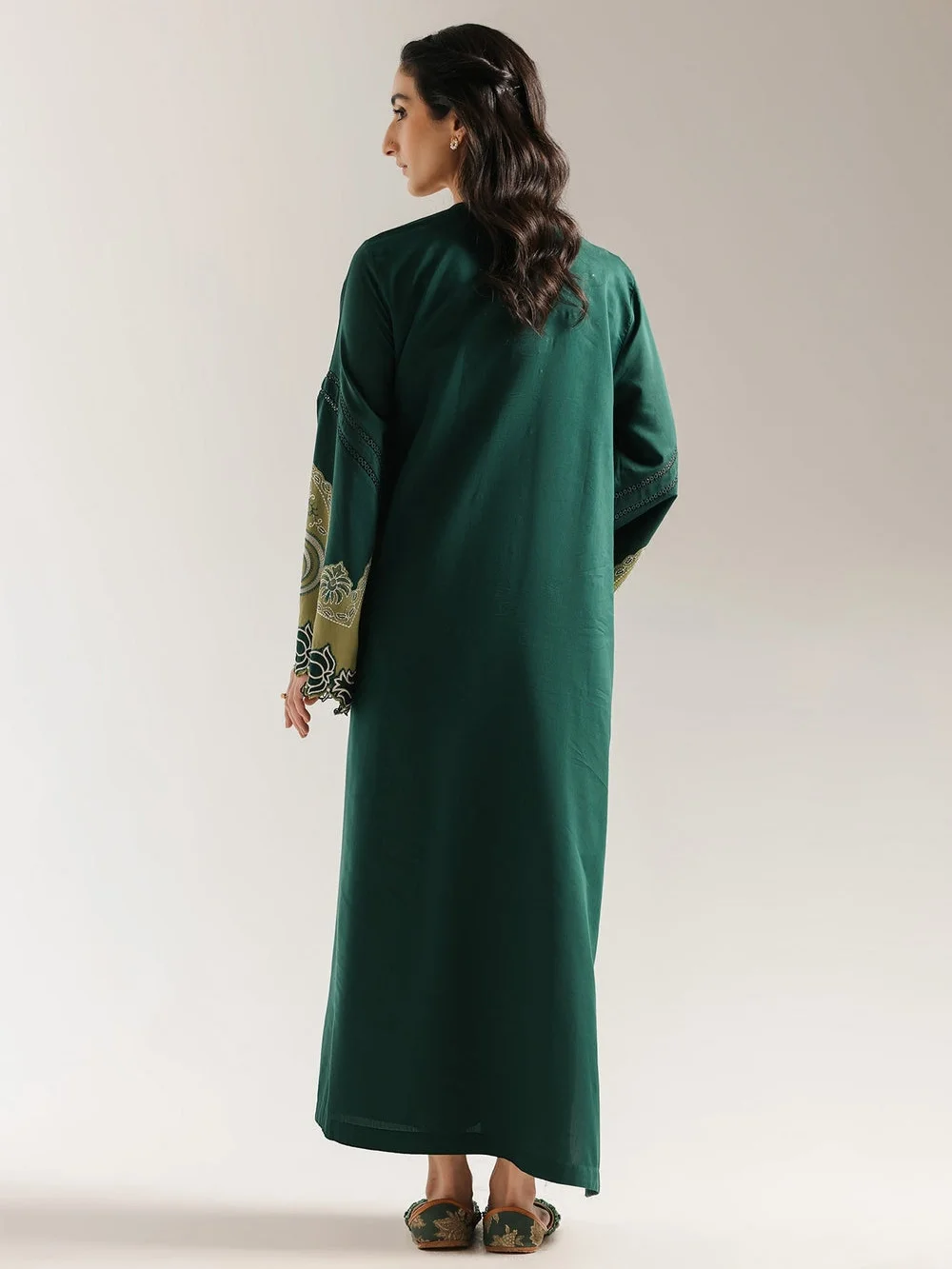 This regal embroidered dress is a vision in a rich, dark green hue. The long, flowing silhouette is enhanced with exquisite, ornate embroidery in a lighter green and gold thread, creating a striking contrast. The detailed floral patterns cascade from the bodice down the front of the dress and along the sleeves, adding a touch of sophisticated elegance. With its graceful V-neckline and intricate embroidery, this dress is a perfect choice for a formal event or a special evening.