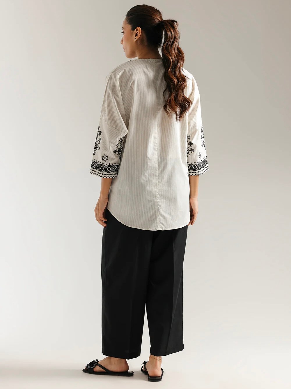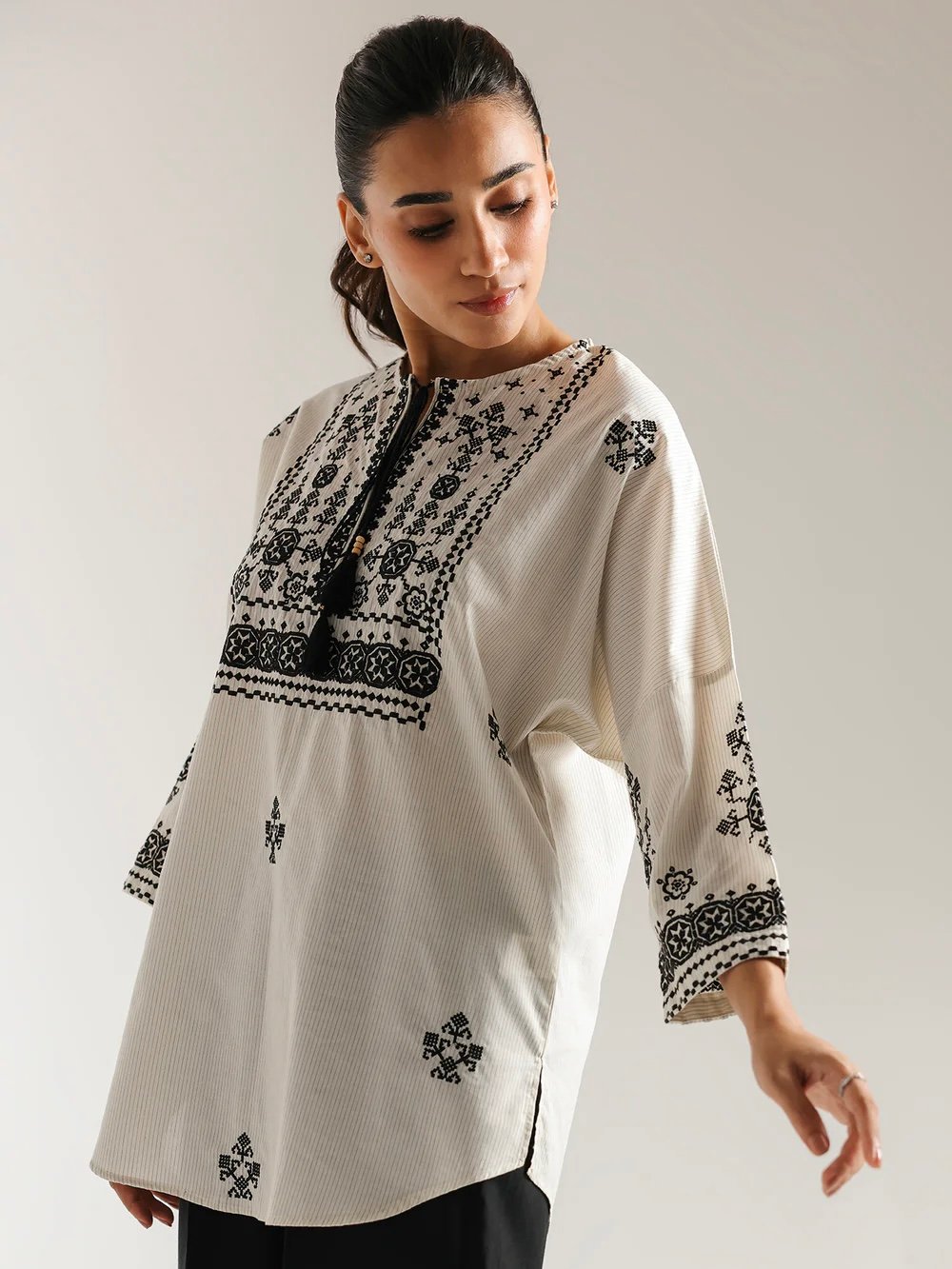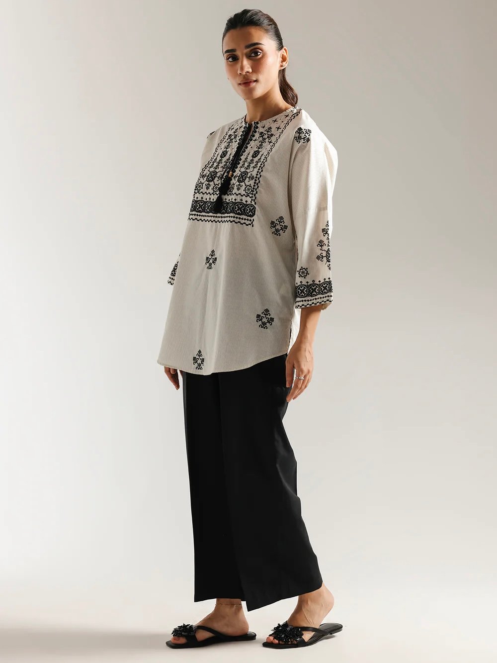 This sophisticated embroidered kurti offers a striking blend of classic elegance and modern design. The crisp white fabric is beautifully adorned with intricate black embroidery in a bold, geometric pattern. With its chic tassel detailing and relaxed silhouette, this piece is a versatile and stylish addition to any wardrobe.