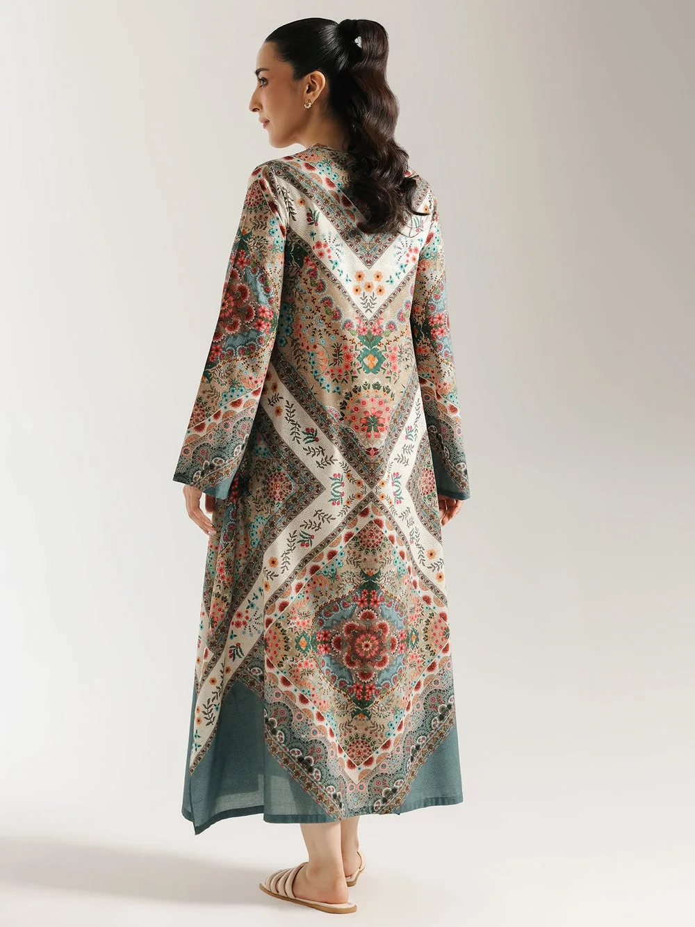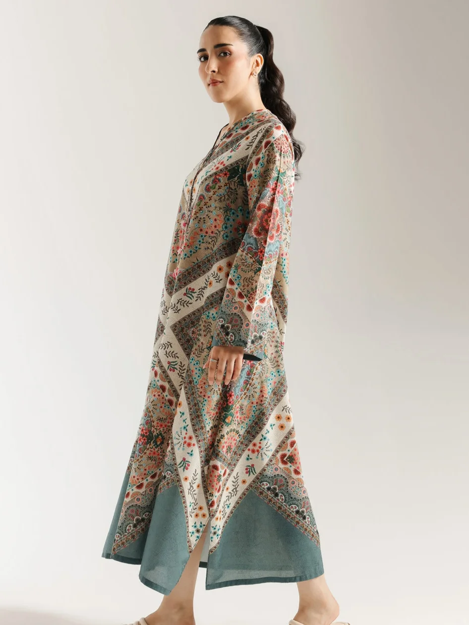 Unleash your inner bohemian with this enchanting printed dress. This stunning piece features a mesmerizing, all-over print in a rich palette of deep greens, rusty oranges, and soft blues. The mandala and floral motifs flow gracefully down the long, fluid silhouette, while the button-up neckline with its tassel detail adds a touch of charm. This dress is a perfect blend of artistic flair and effortless elegance, ideal for a sophisticated and free-spirited look.