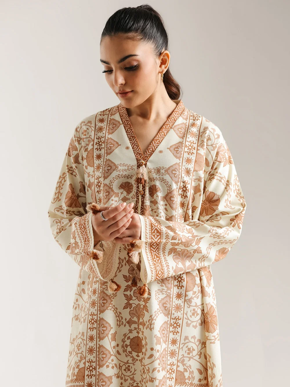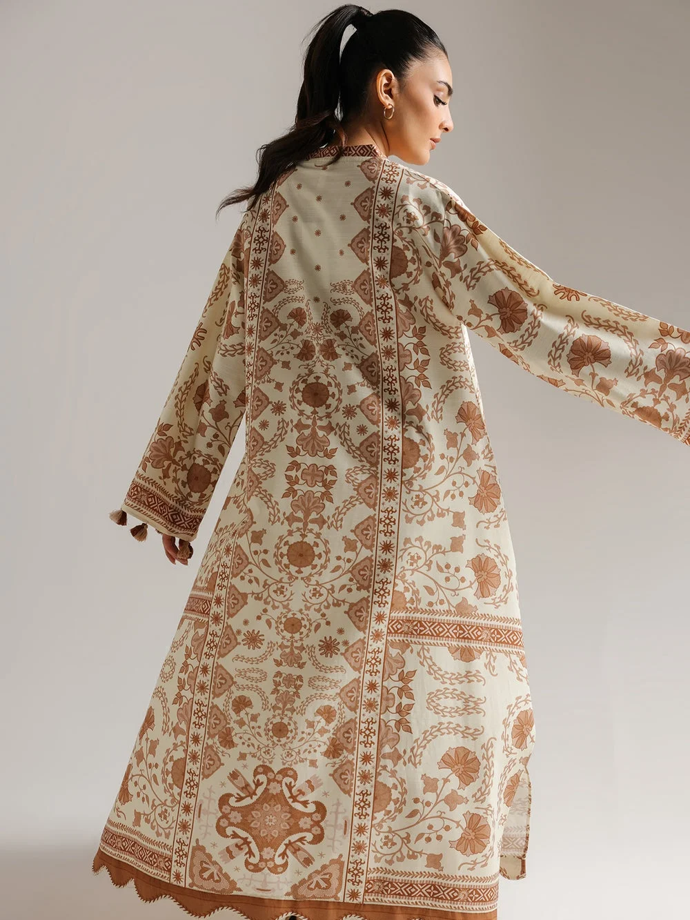 Embrace bohemian elegance with this stunning beige and brown printed maxi dress.This floor-length dress is crafted from a comfortable fabric in a soft off-white or beige base. It features an intricate all-over block-style print in warm brown, showcasing detailed floral, paisley, and geometric border motifs. The dress has a relaxed, flowing kaftan silhouette with long, wide sleeves that end with tassels. A comfortable V-neckline is accented with delicate tassels, completing this effortlessly chic and artistic piece.