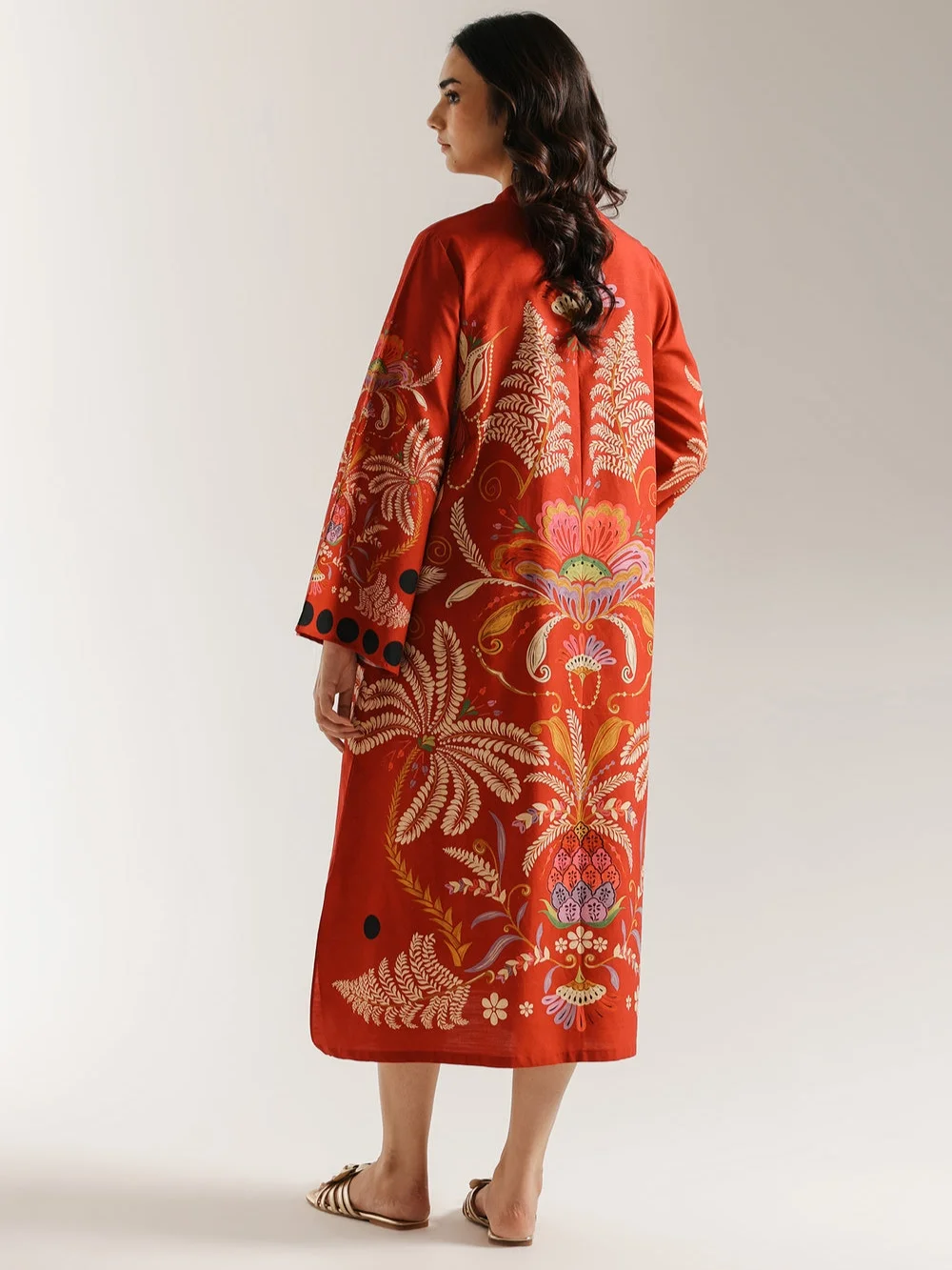 Step into the spotlight with this dazzling red printed dress. This long, straight-cut dress is rendered in a vibrant, fiery red fabric that features a spectacular, all-over traditional print. The rich, highly-detailed motifs—including stylized floral bursts and paisleys in yellow, green, pink, and blue—create a striking contrast against the red base. The dress features a clean V-slit neckline with delicate buttons, and the wide, voluminous sleeves are finished with a contrasting border. This piece is a truly vibrant and comfortable statement outfit.