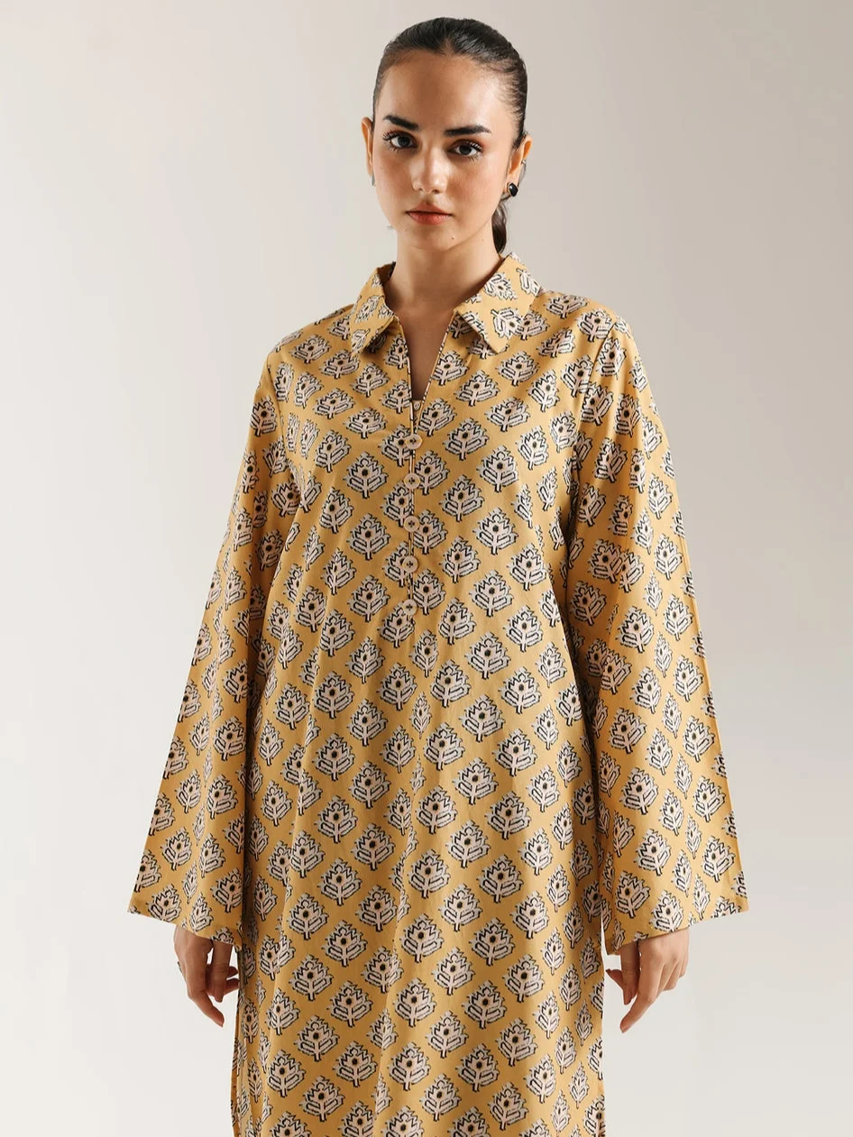 Step out in bold contrast with this captivating printed suit. The relax fit kurta is a rich mustard yellow, featuring an all-over traditional motif print in black and white that covers the entire shirt, including the pointed collar and split neckline. The wide sleeves enhance the relaxed silhouette. The ensemble is dramatically completed by tailored shalwar that boast a striking vertical black and white stripe pattern, creating a unique and sophisticated visual interplay of contrasting prints.