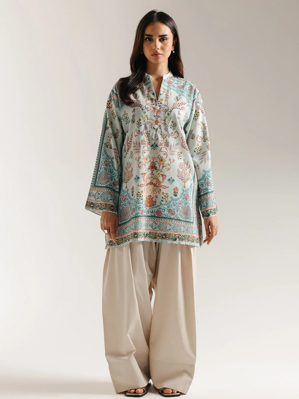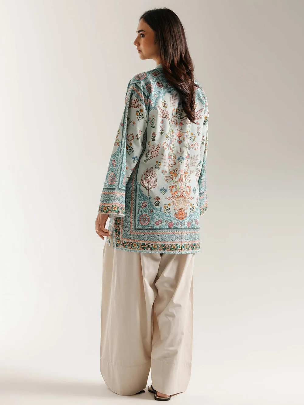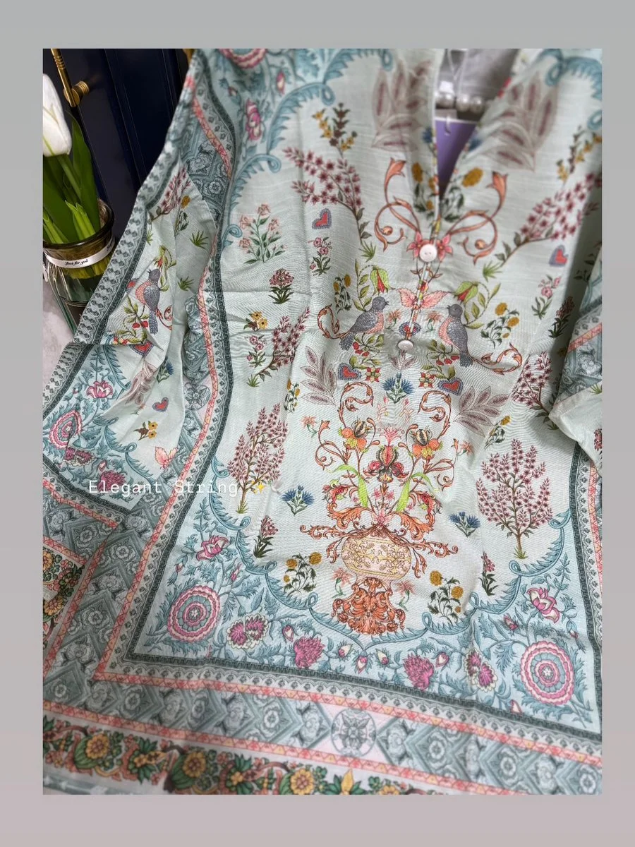 Capture the refreshing artistry of spring with this delightful ice-blue printed shirt. This short, relaxed-fit shirt is crafted from a cool, light fabric and features an exquisite all-over ornamental print. The print showcases elaborate floral and stylized motifs, including central decorative elements in shades of rust, sage green, and muted teal. The neckline is detailed with small buttons, and the long sleeves and hem are beautifully finished with coordinating borders. This shirt is perfect for everyday wear.