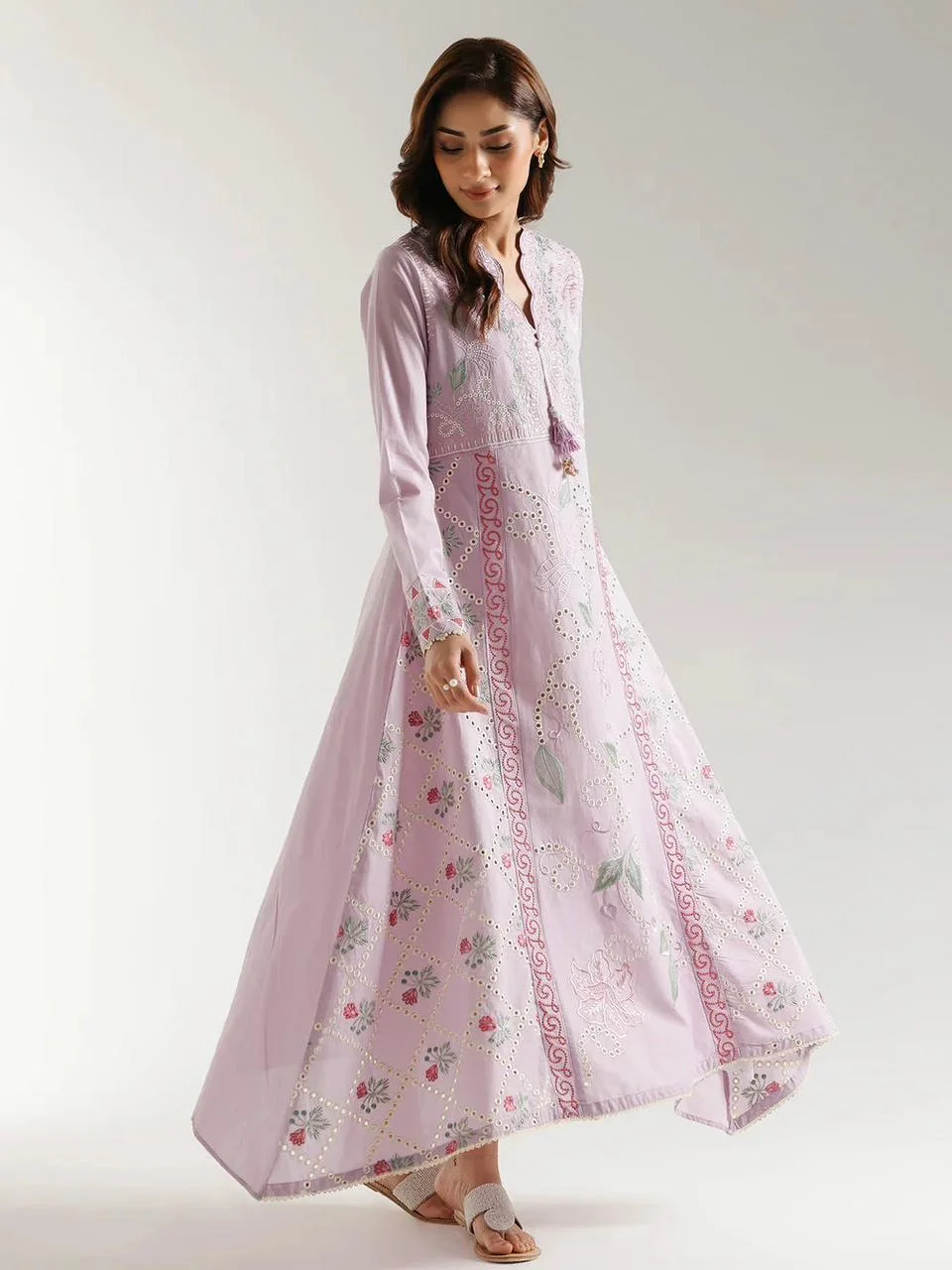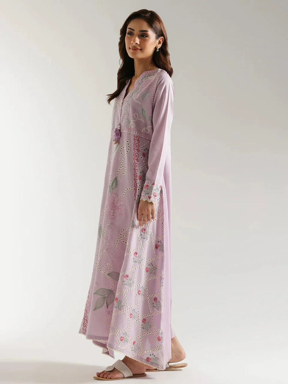 This long, flowing shirt in a delicate pale coral hue is a vision of subtle elegance. Intricate schiffli embroidery creates a beautiful openwork pattern, forming floral and vine-like designs that cascade down the fabric. The V-neckline features delicate detailing and tassel accents, adding a touch of bohemian charm. The long sleeves are finished with subtle embellishments, enhancing the overall graceful silhouette. Crafted for comfort and movement, this shirt is a versatile piece perfect for warmer days, easily dressed up for special occasions or styled casually for an effortlessly chic look.