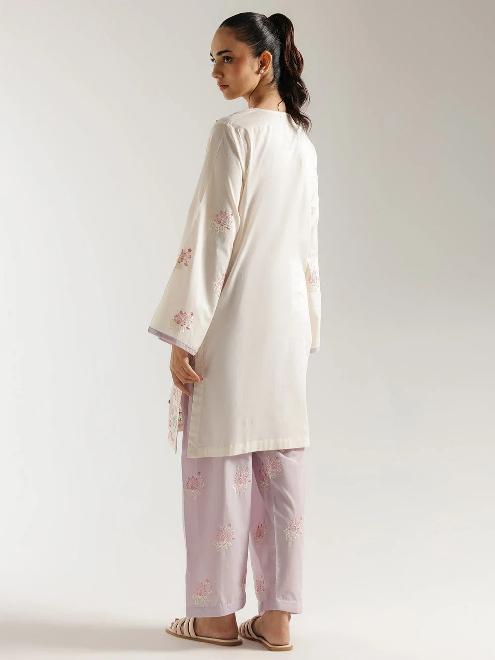 Embrace delicate charm with this enchanting ivory & lavender embroidered ensemble, a harmonious blend of subtle hues and exquisite craftsmanship. The serene ivory tunic features a beautifully detailed V-notch neckline, intricately embellished with soft pink, green, and lavender floral embroidery that cascades elegantly across the front and sleeves. A contrasting lavender trim along the neckline and cuffs adds a touch of refined elegance. Complementing the tunic is a wide leg shalwar, in a gentle lavender shade, adorned with delicate embroidered motifs at the hem, creating a cohesive and visually stunning look. Perfect for sophisticated daytime gatherings, festive celebrations, or simply when you desire to exude graceful charm and artistic flair.