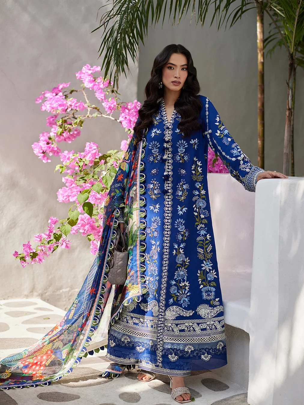 Showcasing a visual symphony, Veira is a spectacular cobalt blue shirt featuring floral motifs and cascading tendrils accented with lavish thread and sequins. Richly detailed motifs for the front border can be used to grace the shirt hem lending the outfit textural intrigue. Bold floral compositions adorn the silk dupatta and the embroidered bottom adds an element of artistic finesse to the outfit.