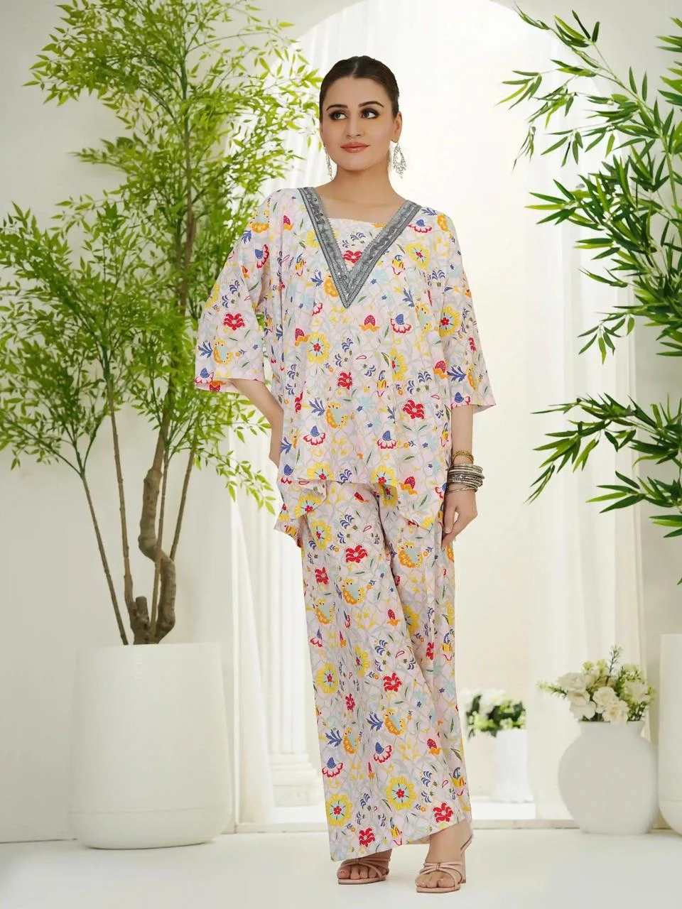 Elevate your summer wardrobe with this breezy Swiss lawn set, featuring a charming floral print in vibrant hues. The loose-fit shirt ensure all-day comfort while exuding effortless elegance. Intricate lace detailing on the neckline adds a graceful touch.
