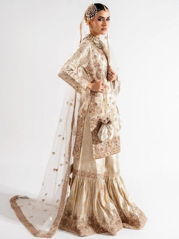 Introducing “Ujala”. This beautiful ensemble features a knee-length shirt and gharara pants in a soft off-white hue. The ensemble is simple and subtle, yet elegant enough to bring you to the spotlight. beautifully adorned with luxurious gold zari work. The shirt features intricate floral embroidery while the neckline and full sleeves are enhanced with delicate gold embellishments, creating an ethereal look. Paired with wide-flared gharara pants, also featuring delicate gold embroidery in a jamawar fabric. Completing the look is a pristine white net dupatta, elegantly embroidered with floral motifs and bordered with intricate golden threadwork.