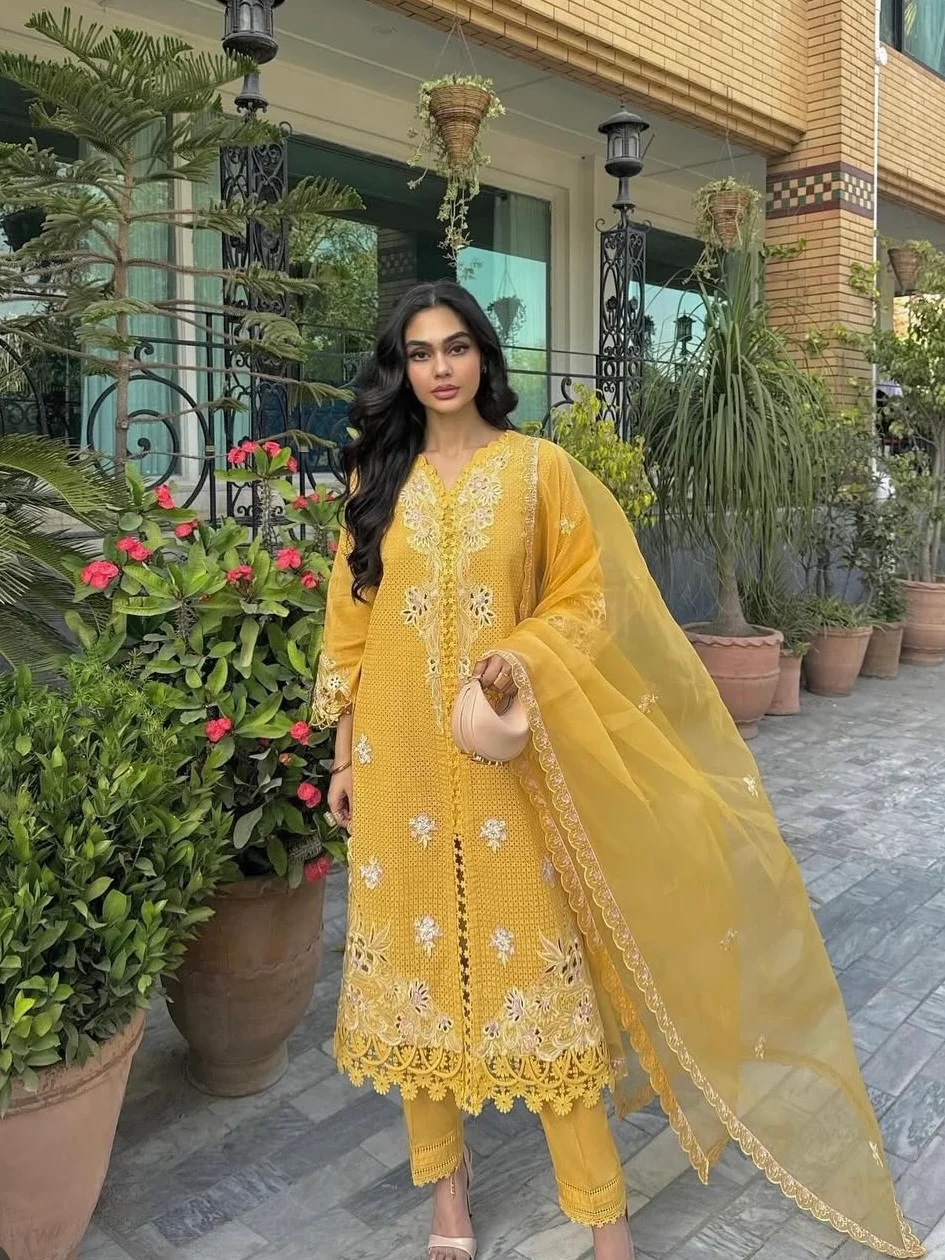 Explore the allure of our Mimosa Mustard three piece stitched lawn suit, where a beautiful shade of yellow meets playful geometric and floral motifs in aquas and pinks. Adorned with embroidered cutwork on the daman, neckline, and sleeves. It is paired with an exquisitely crafted weightless organza dupatta for all your soirées.
