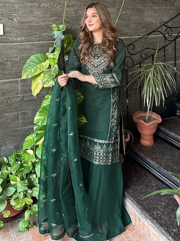 This exquisite Festive/Party Wear set features a dark green Kurti with embroidered chiffon detailing, paired with a flared Sharara in chiffon and a stunning Organza Dupatta. Perfect for all seasons, this 3-piece ensemble from Laal Clothing boasts intricate work techniques and a graceful design that exudes elegance.