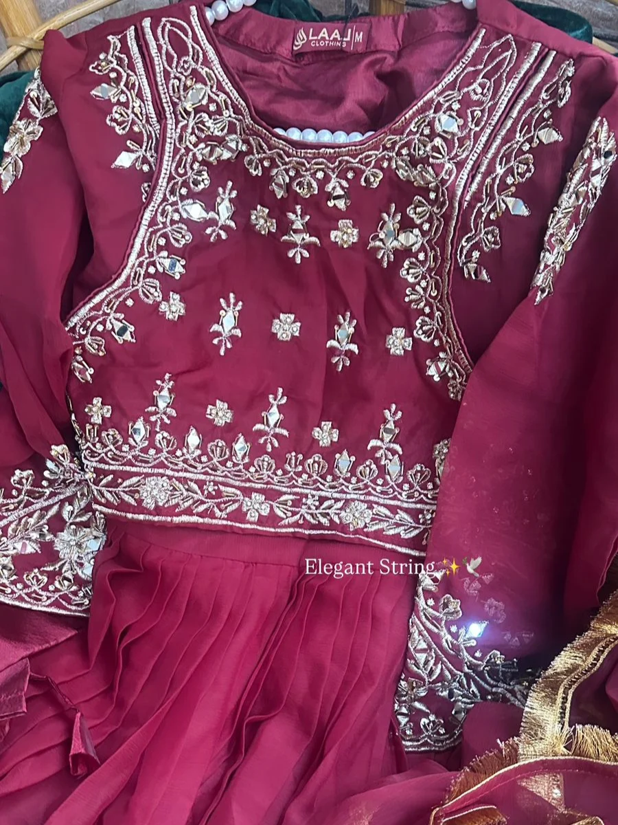 This dress features a voluminous maroon maxi made from chiffon, beautifully embellished with intricate tone-on-tone sequins and beadwork. It comes with a lightweight chiffon dupatta adorned with kiran lace and is complemented by matching straight trousers.