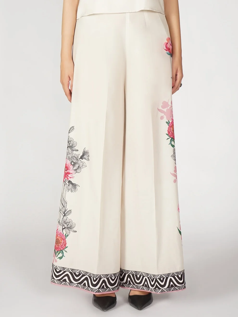 - These flared pants made in soft crepe fabric in floral print features semi-elasticated waistband, side zipper opening, side hook & eye closure.