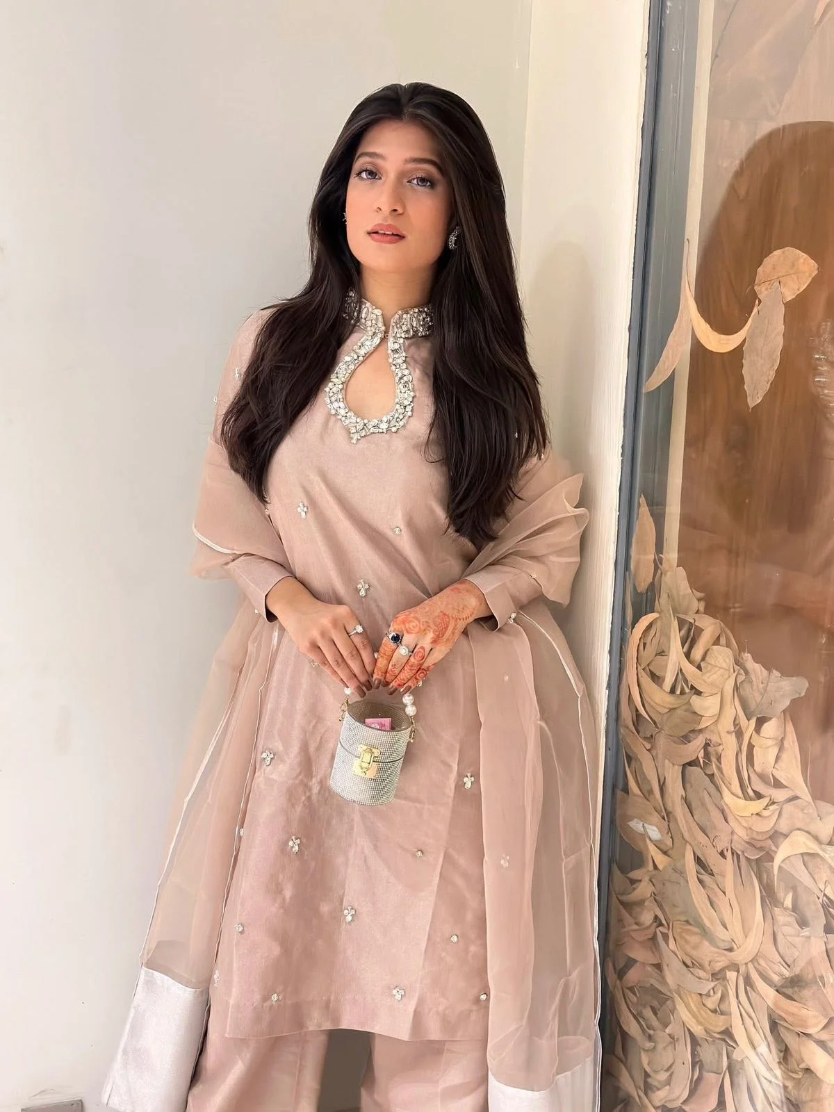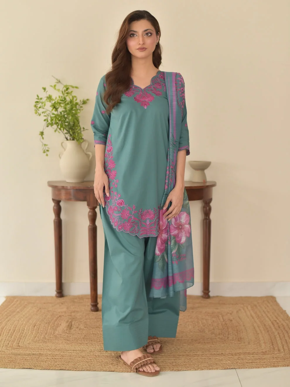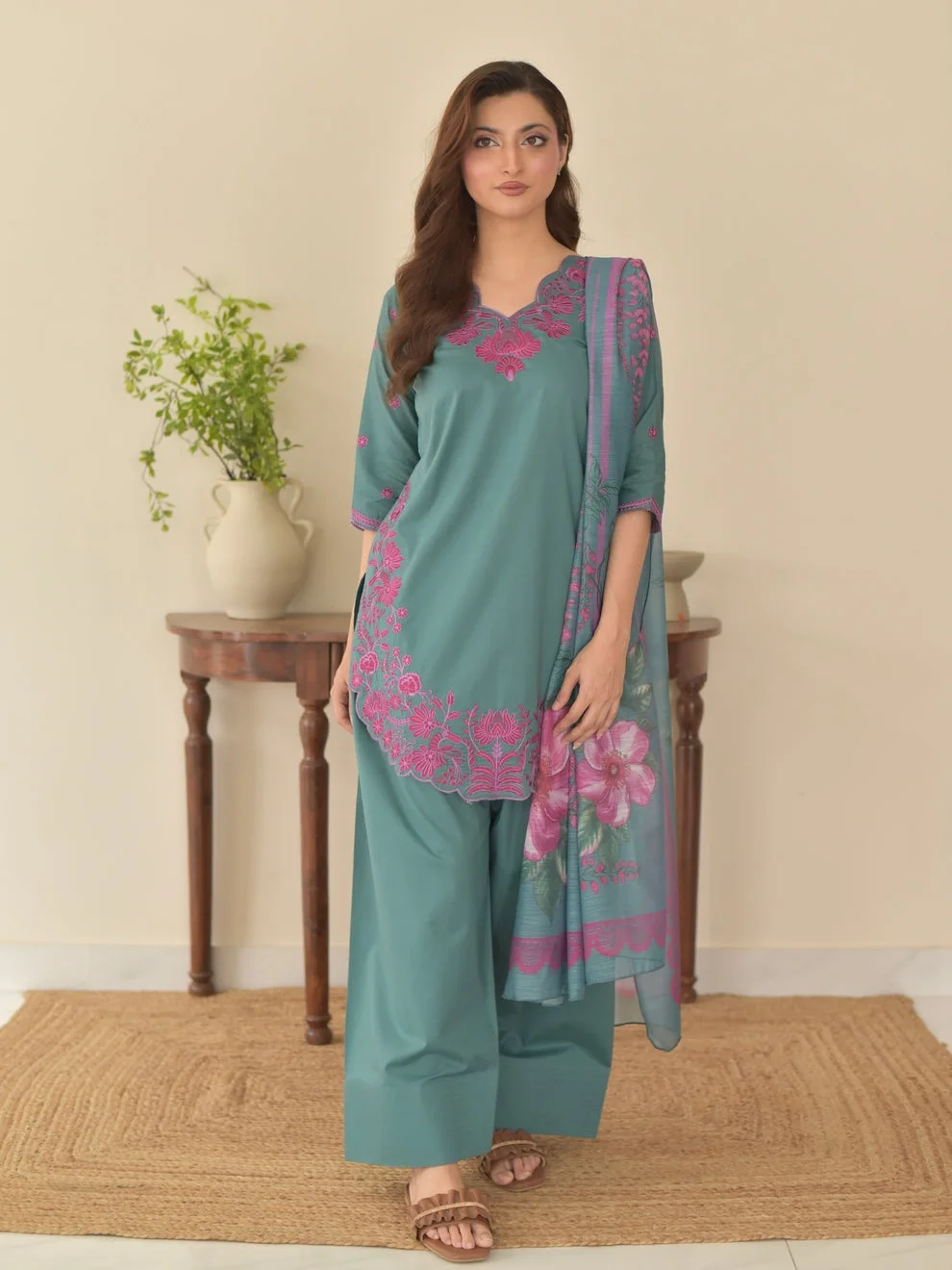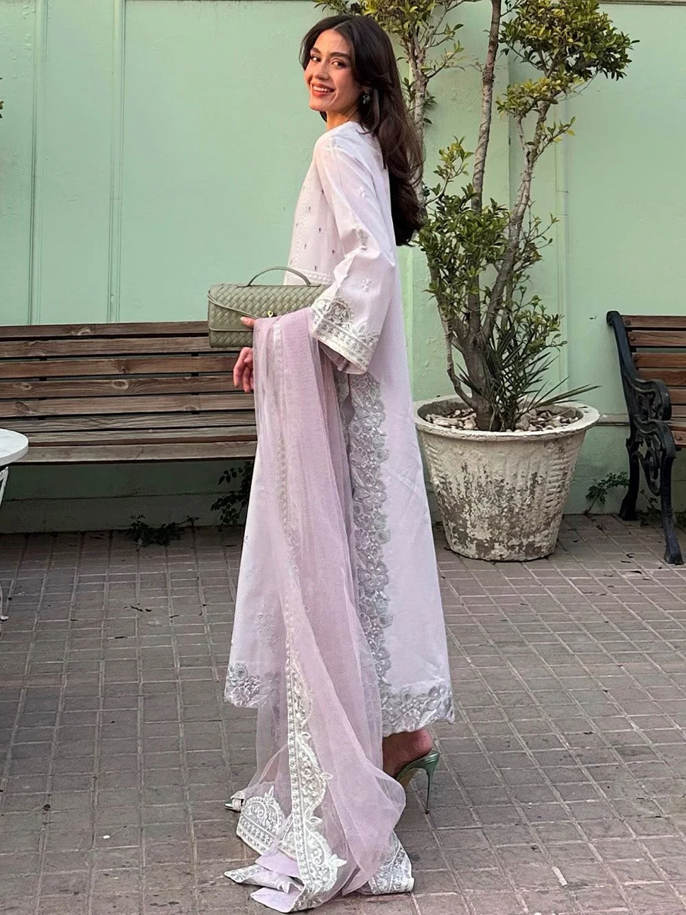 Grace meets gracefulness in this 3-piece pret ensemble, rendered in the soothing shade of Dream Blue. The lawn shirt features a refined crew neckline, accentuated with delicate chatta patti piping for a hint of tradition. A straight, fully embroidered silhouette is brought to life with organza-embroidered borders adorning the sleeves, sides, and hem for a touch of artisanal charm. The straight cambric cotton trousers are thoughtfully detailed with an embroidered border, blending comfort with elegance. Completing the ensemble is a dreamy net dupatta, edged with four-sided embroidered borders, adding lightness and finesse to this timeless look.