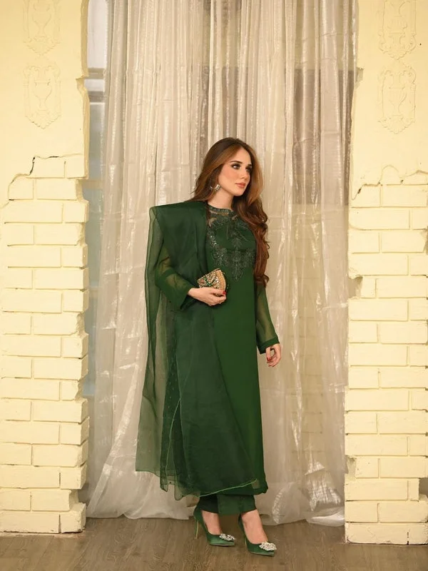 3 piece stitched outfit adorned with sequins and thread work.