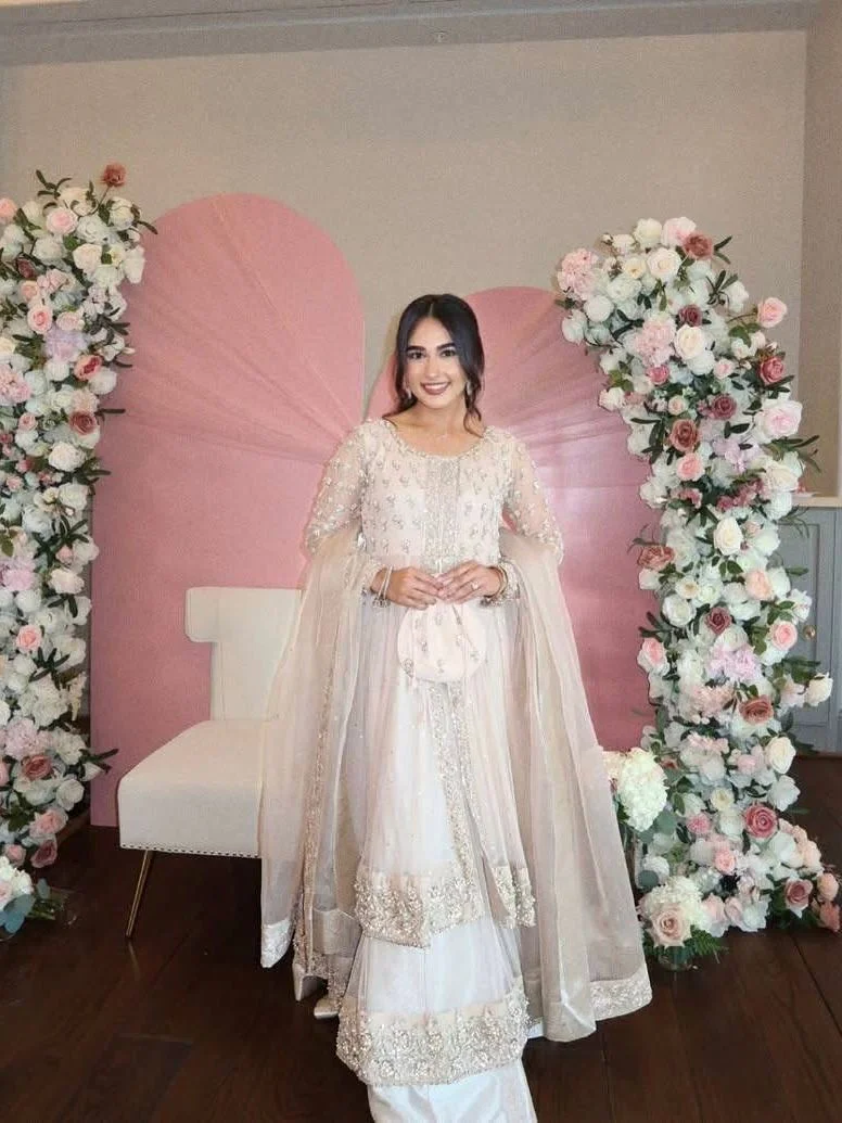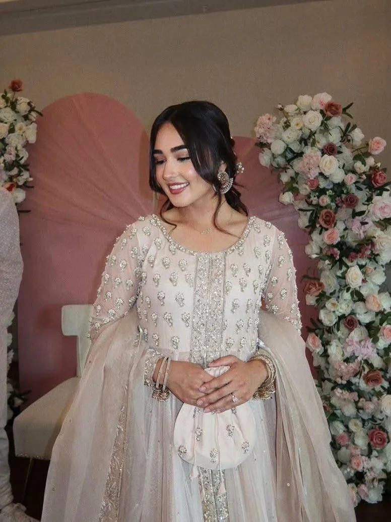 A resplendent double-layered beige rose net pishwas evokes a sense of regal allure that commands attention. It is crafted with exceptionally intricate gold embellishments of adda work on the bodice, sleeves, and hemline. The multi-head borders along the neckline and center add a touch of sophistication.