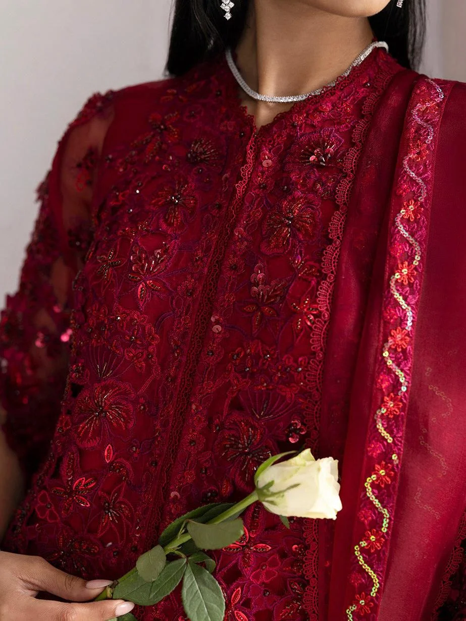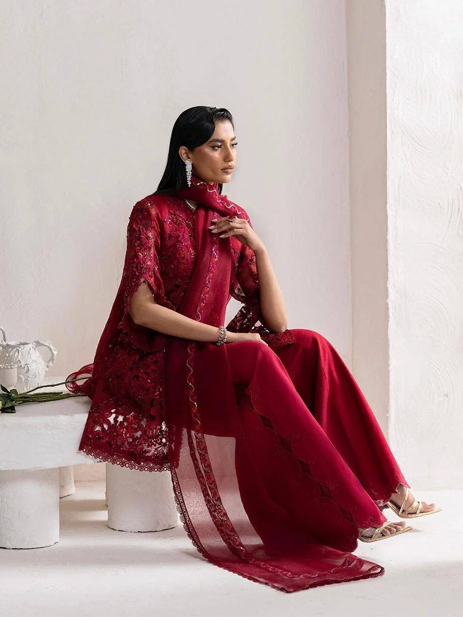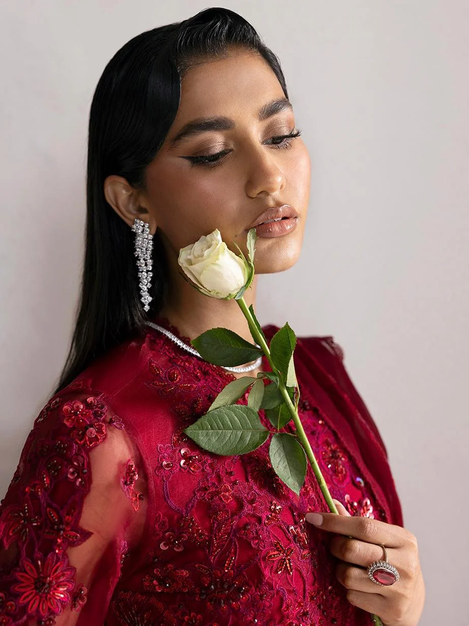 Imbued with refined elegance, this deep red on red dress harnesses grace and finesse. Crafted on organza fabric, the embroidered shirt features a timeless ditsy floral red embroidery with captivating hand work details in hues of red. A sleek organza dupatta and cutwork stitching detail on culottes add the perfect finishing touch to the dress, making this set a versatile addition to your festive wardrobe.