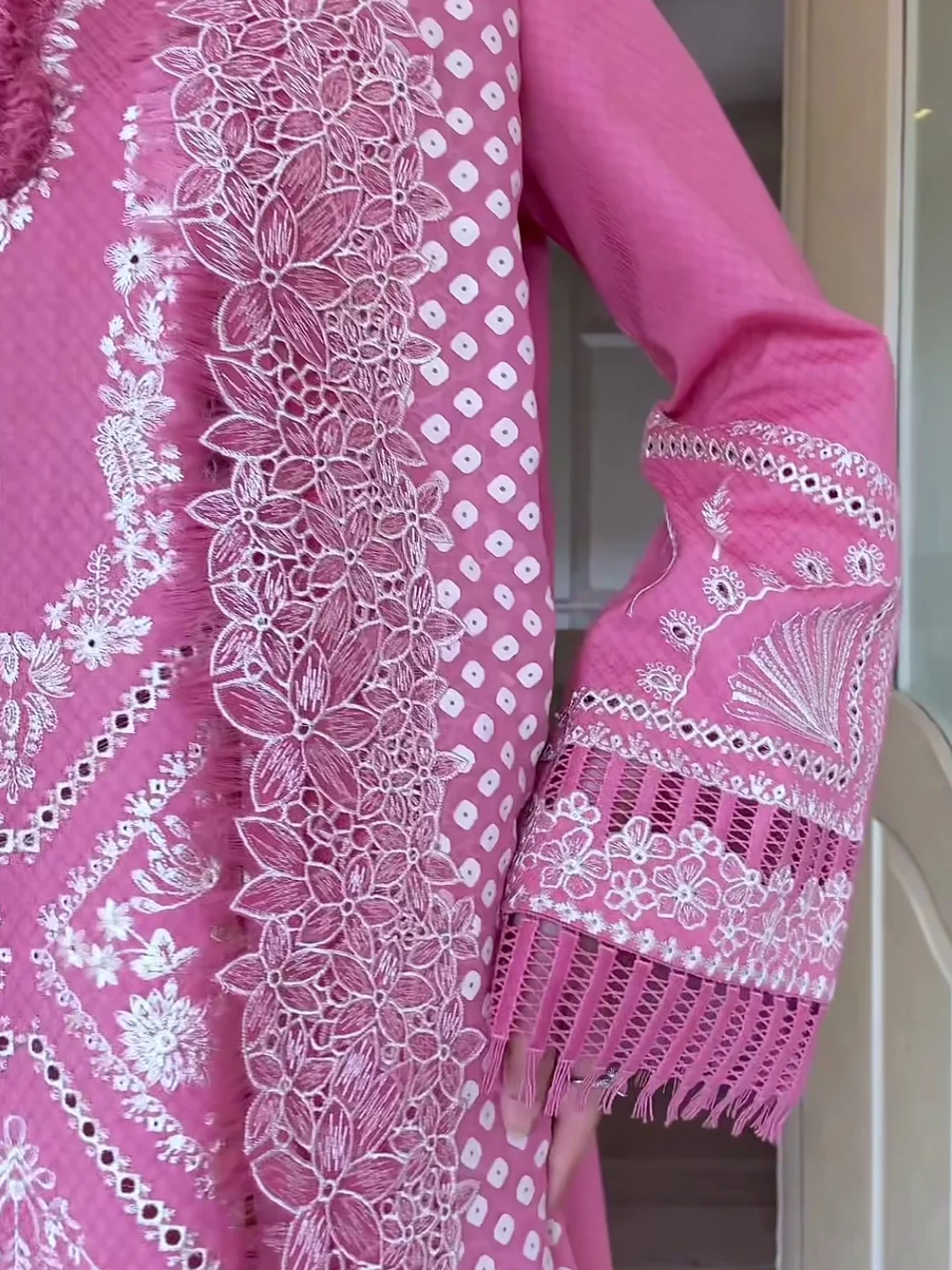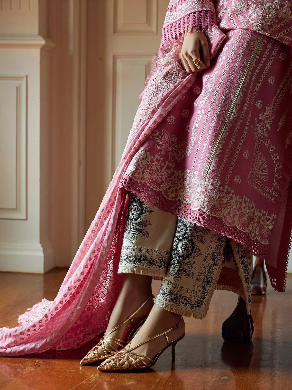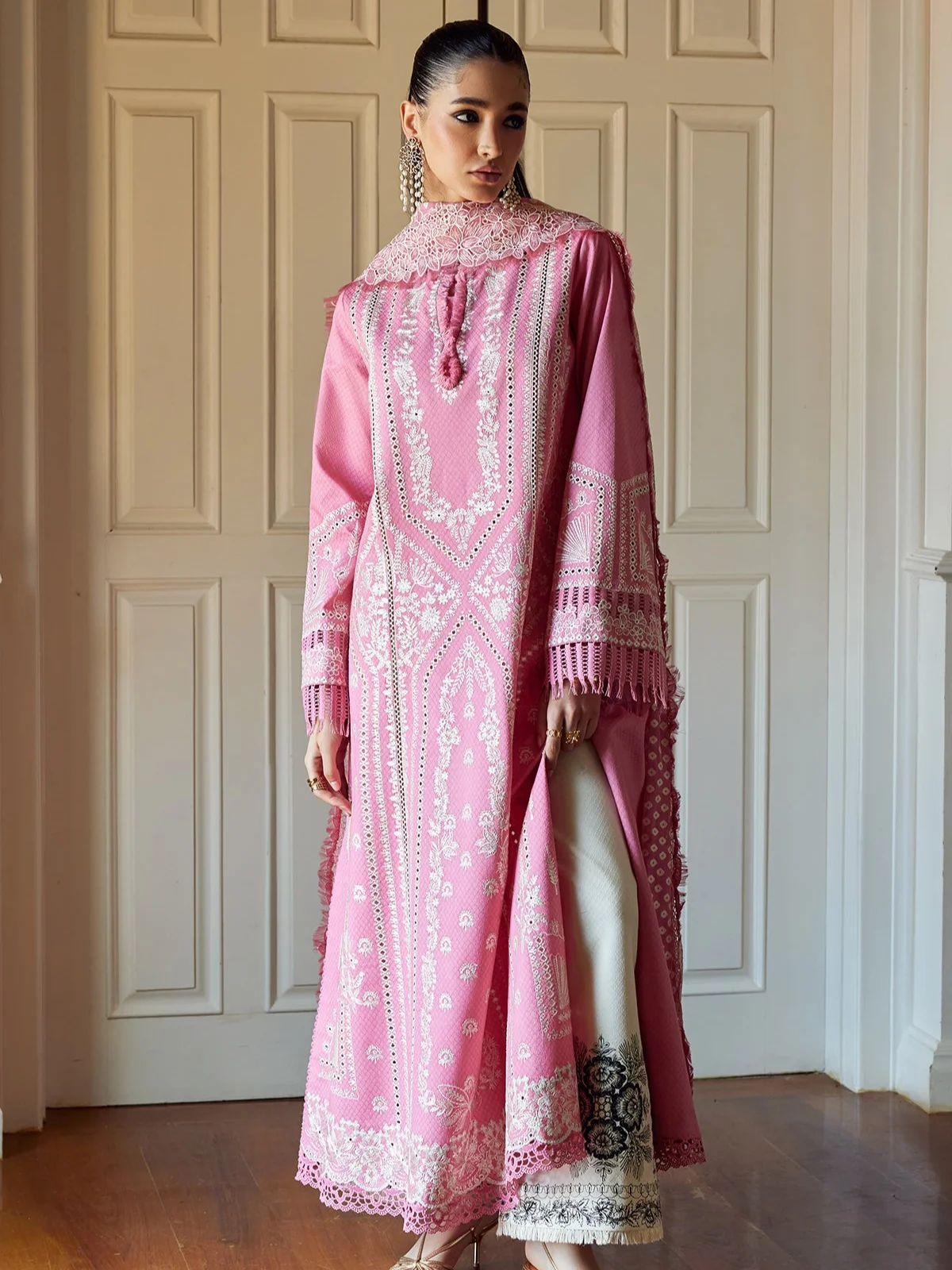 Introducing our stunning candy pink kurta, featuring exquisite boring embroidery that adds a touch of elegance. This beautiful piece is paired with chic off-white pants, adorned with striking black embroidery for a stylish contrast. Completing the look is a chiffon dupatta showcasing traditional screen-printed chunri patterns and embroidery. This ensemble combines modern style with classic charm, making it perfect for any festive occasion!