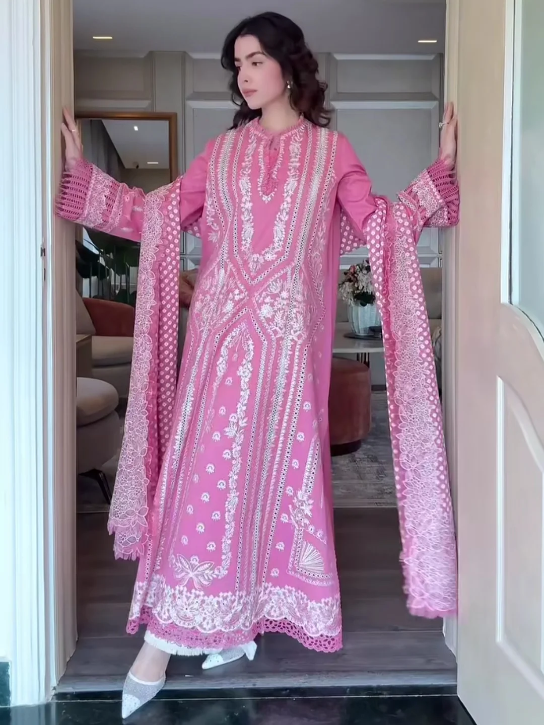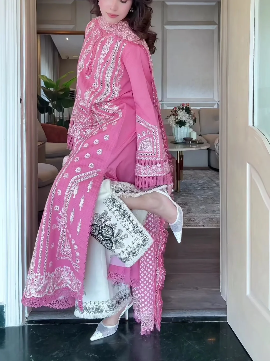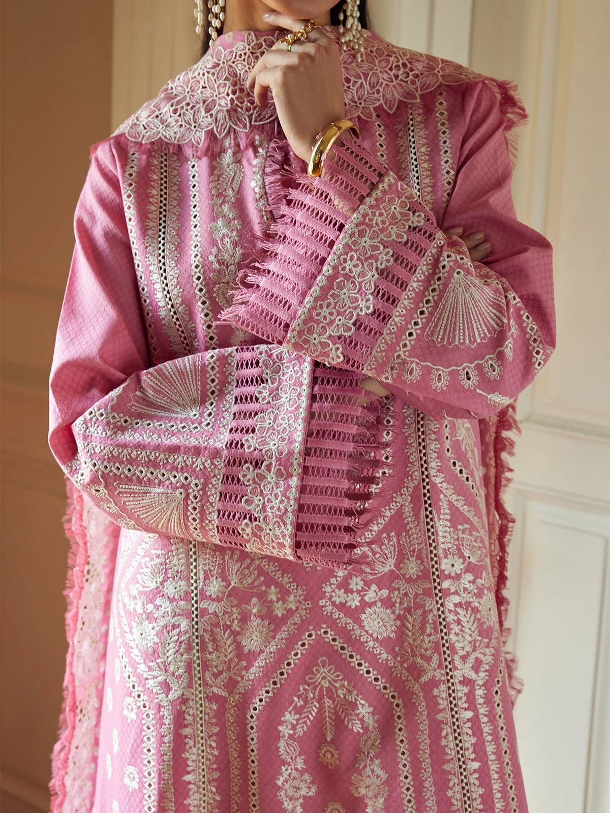 Introducing our stunning candy pink kurta, featuring exquisite boring embroidery that adds a touch of elegance. This beautiful piece is paired with chic off-white pants, adorned with striking black embroidery for a stylish contrast. Completing the look is a chiffon dupatta showcasing traditional screen-printed chunri patterns and embroidery. This ensemble combines modern style with classic charm, making it perfect for any festive occasion!