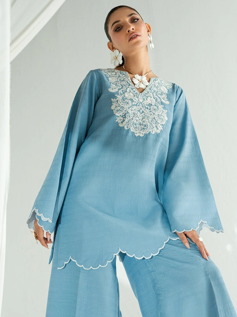 This ensemble comes in the prettiest shade of blue, exuding effortless charm and serenity. The shirt features a delicate white embroidered neckline, complemented by scalloped detailing along the hem and sleeves. Paired with matching loose pants that flow like a summer breeze, this outfit offers both comfort and elegance. Crafted from lightweight and breathable pure lawn.