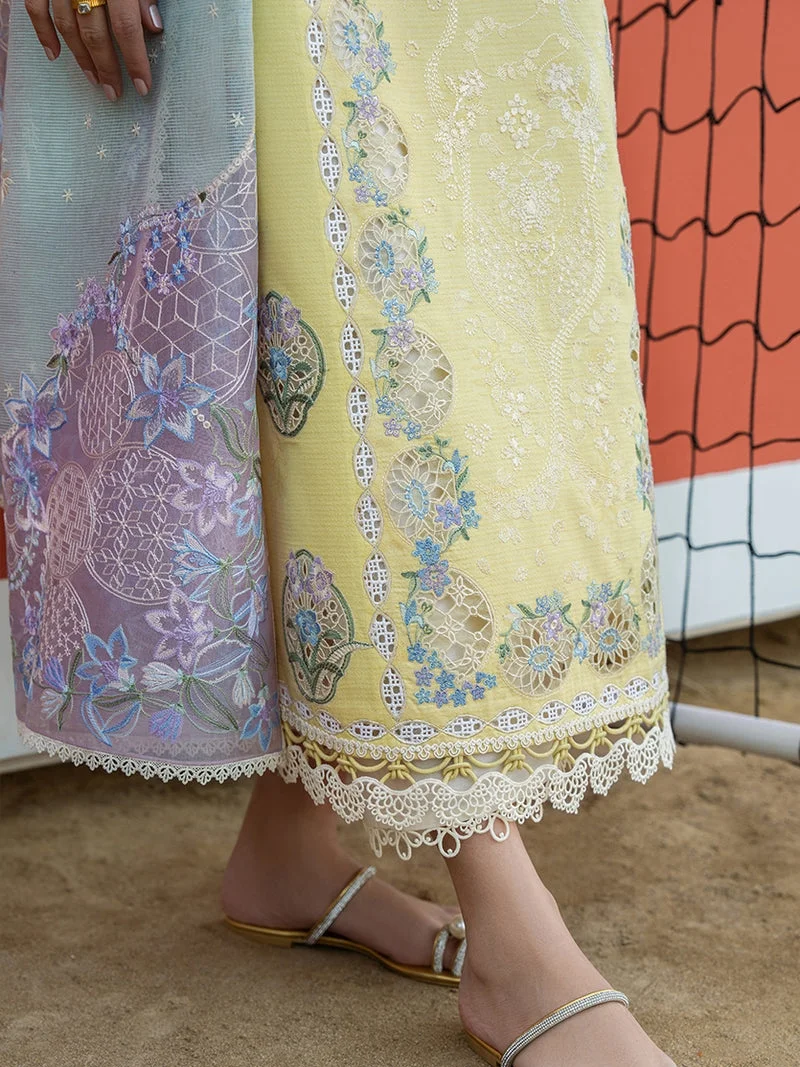 This sunshine-yellow, three-paneled kurta stuns with a textured floral base, vibrant stained glass inspired embroidered Organza cutouts, and a statement center panel. The double-layered borring jaali neckline and scalloped lace sleeves bring a playful twist with soft hues of lavender, sage, eggshell, and rose. Paired with sleek cambric pants and a breezy Monark dupatta, this look is pure summer festivity in motion!