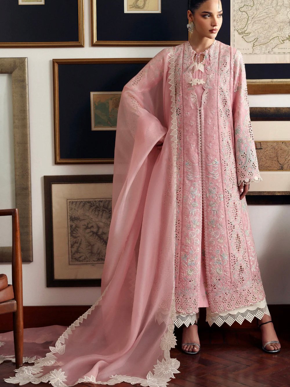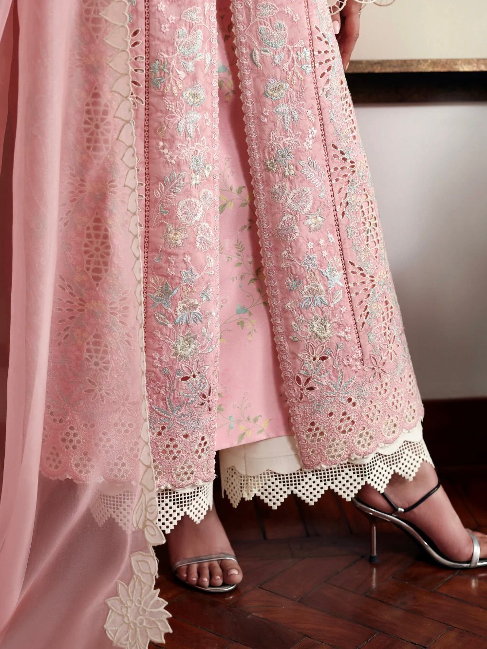 The outfit features a graceful double-jacket silhouette, with a solid lawn upper layer paired over a delicately printed inner shirt, creating depth while keeping the look light and breathable. The ensemble is complemented by an organza dupatta finished with elegant off-white cutwork borders, adding a refined summer charm. Off-white pants complete the look, balancing softness with clean structure.