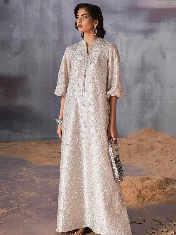 - Silk Silver Tissue silk crew necked floor length shirt with raglan balloon sleeves. It has over all embroidery and spray embellishments enhance the look. Front and neck tassels and pearl and swaroski work on neck and sleeve. Comes with a slip.