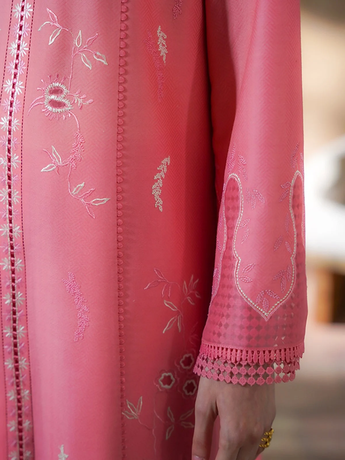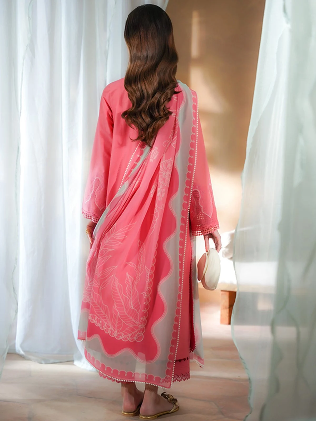 - Salmon Rose Pink textured lawn, front open panelled a-line silhouett.