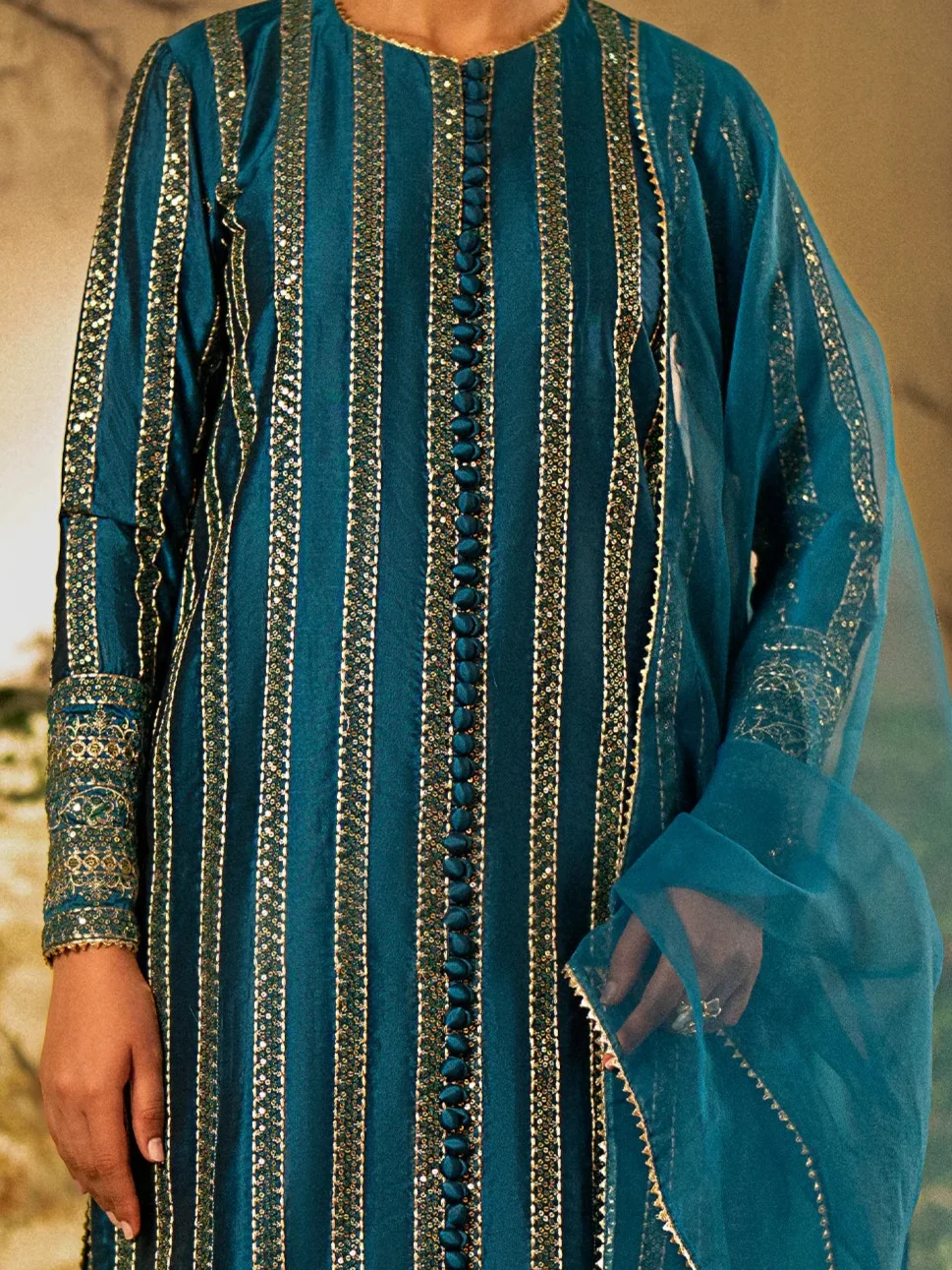 - Teal blue front open shirt with linear embroidered pattern finished off with embroidered borders, paired with sharara pants and organza dupatta.