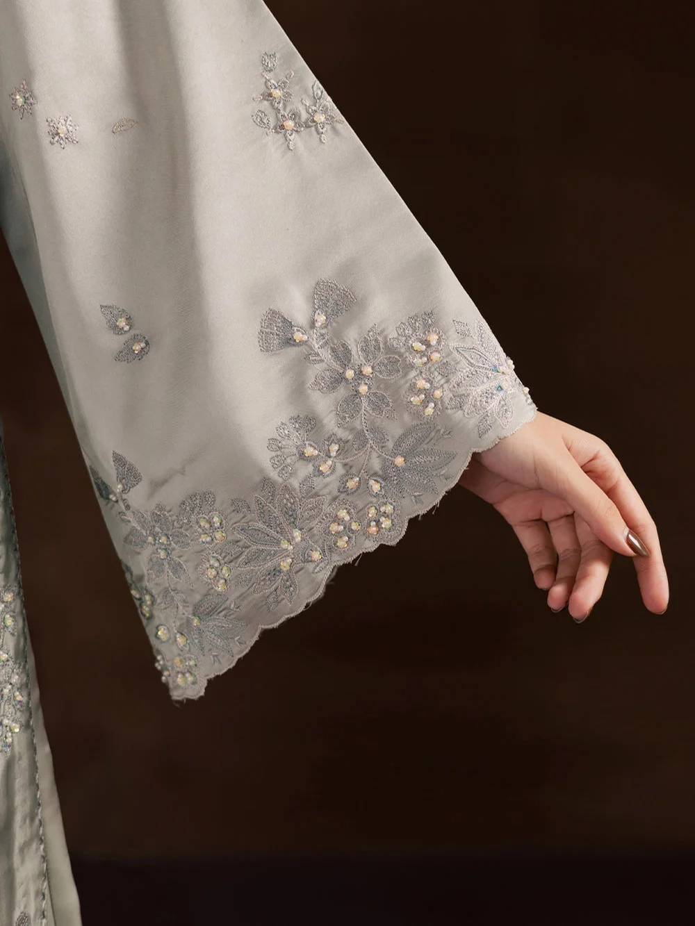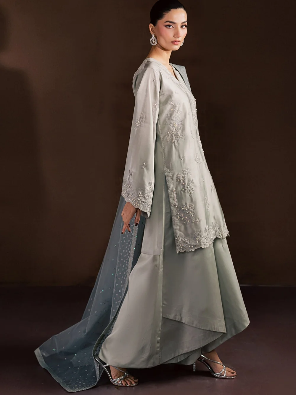 A timeless ensemble crafted in delicate grey shamoos silk, featuring fine embroidery enhanced with subtle hand embellishments that add a soft, elegant shimmer paired with fluid wide-leg trousers for modern grace. Completed with a sheer organza dupatta.
