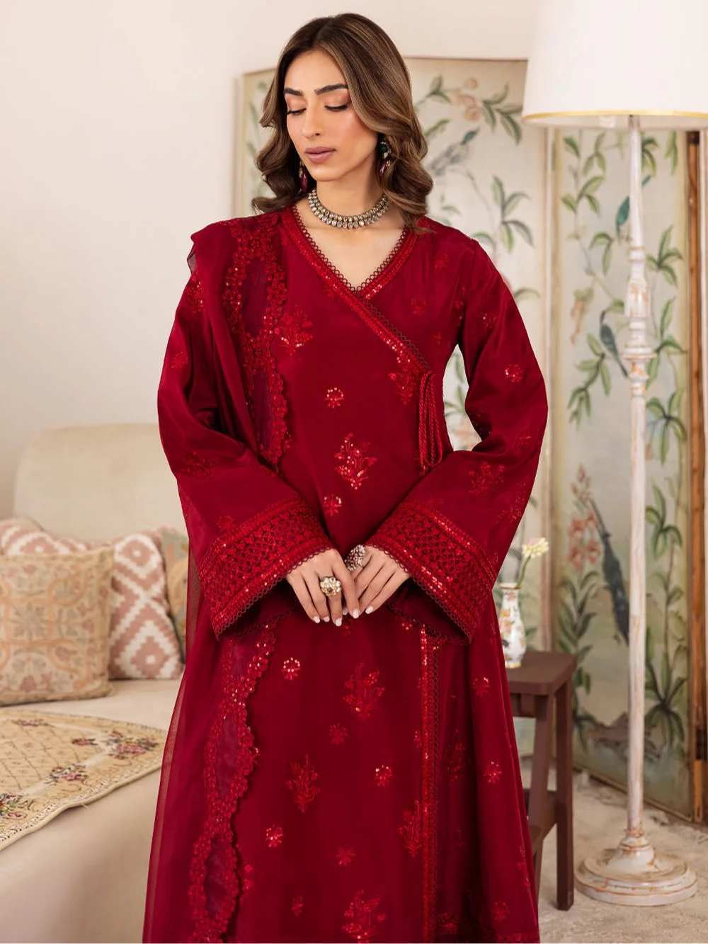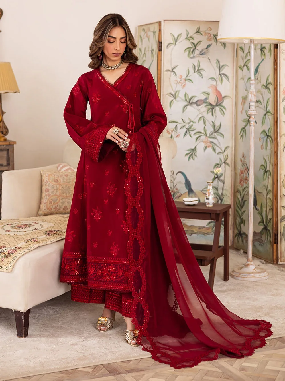 A premium silk crimson red angrakha with self embroidery, sequin details and front tassel, paired with embroidered culottes and a chiffon dupatta with four-sided border