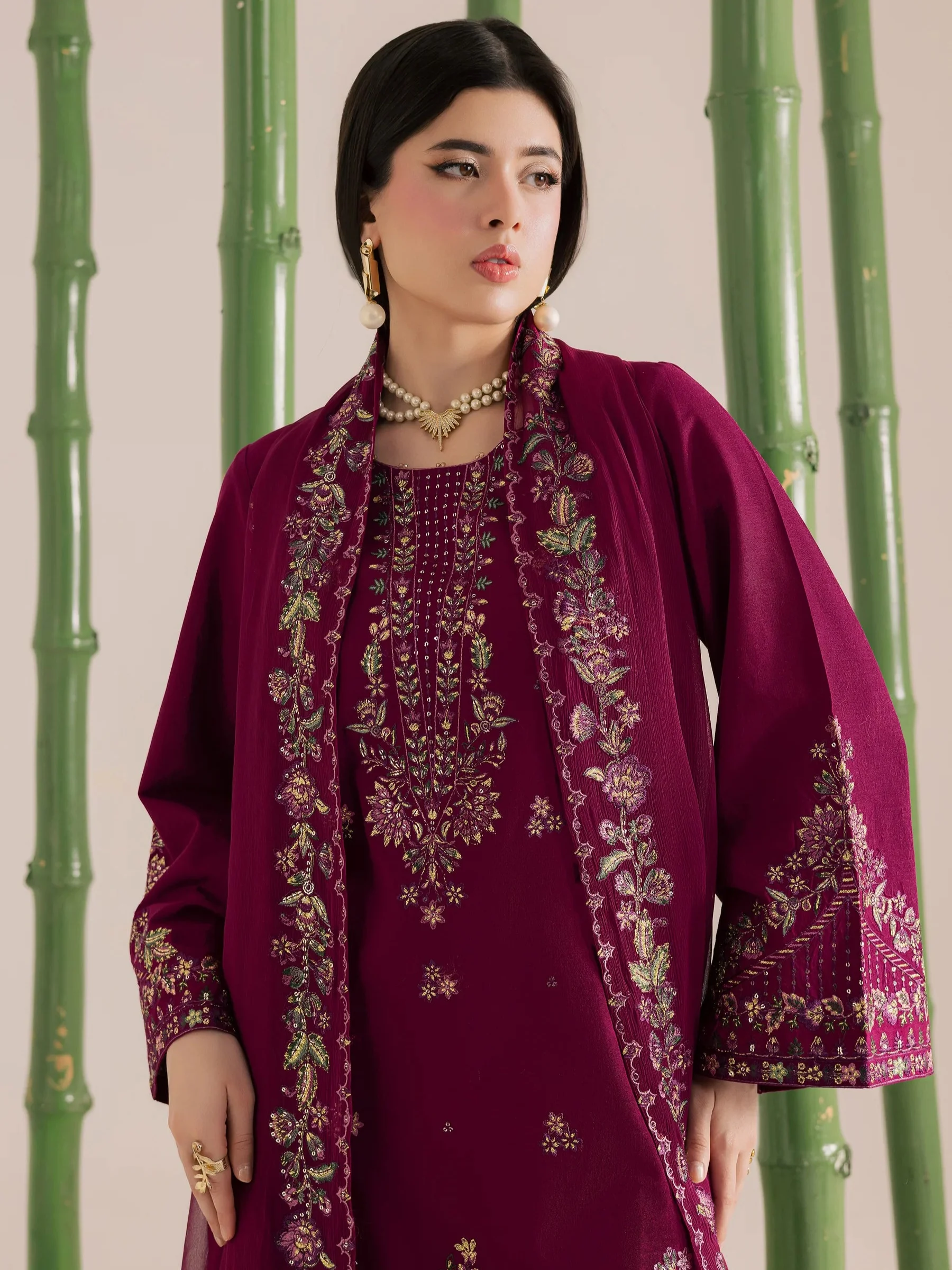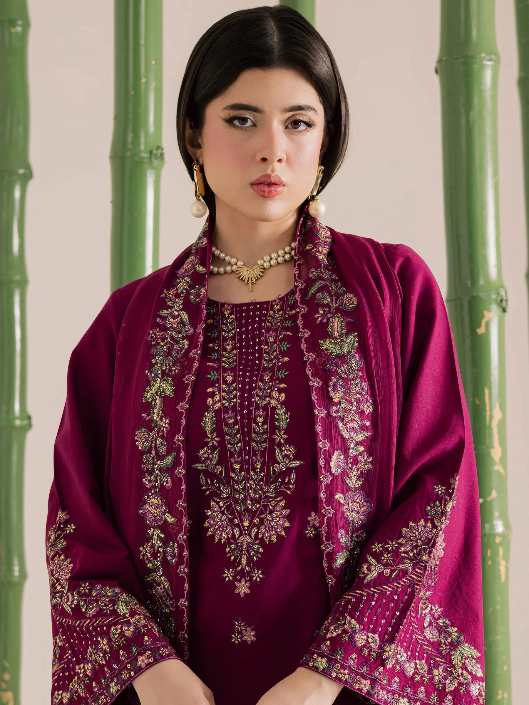 This magenta purple three piece Premium Lawn ensemble features a heavily embroidered shirt front paired with composed embroidered sleeves, creating a rich and cohesive look. The shirt is finished with delicate beads that add a subtle shimmer and elevate the overall detailing.