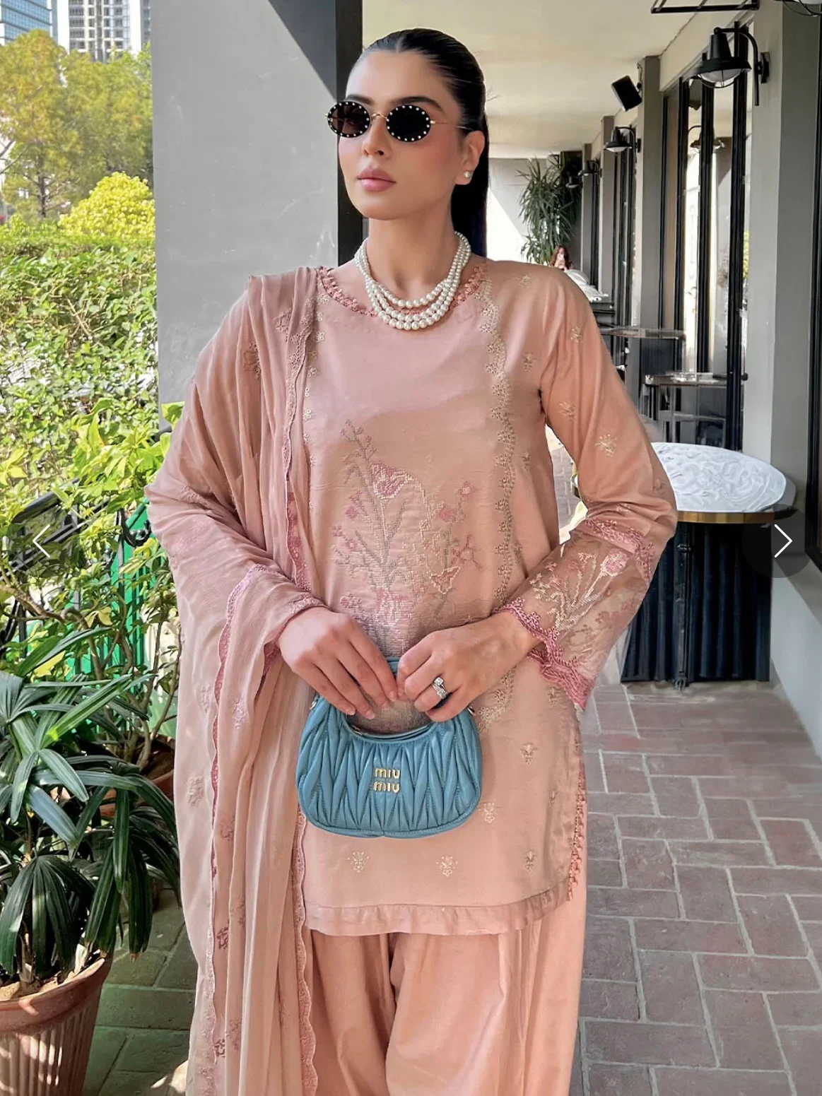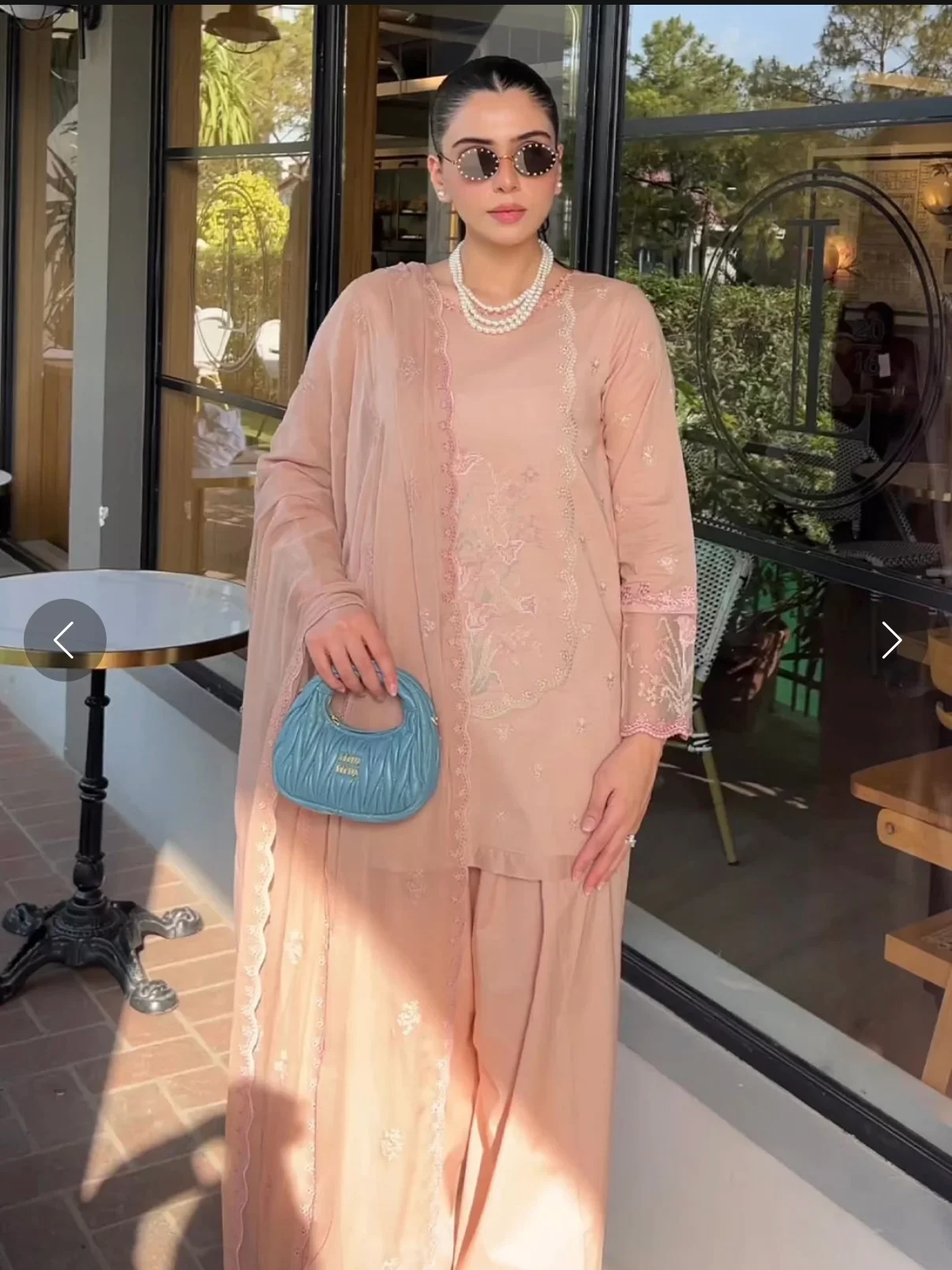 Soft as a whisper, this peachy ensemble is adorned with delicate embroidery and a flowing Chiffon dupatta, perfect for daytime elegance. Styled with pearls and a pop of contrast, it’s an ode to effortless grace.