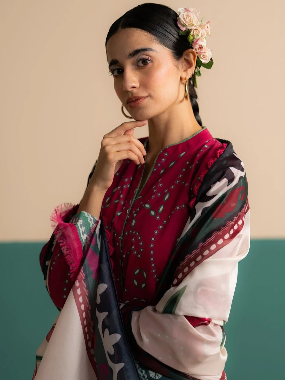 Shirt: A digitally printed lawn shirt in a green-on-scarlet red palette, featuring intricate patterns that blend traditional motifs with modern aesthetics.
