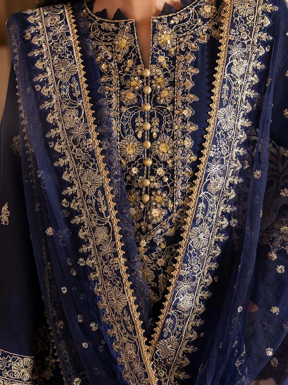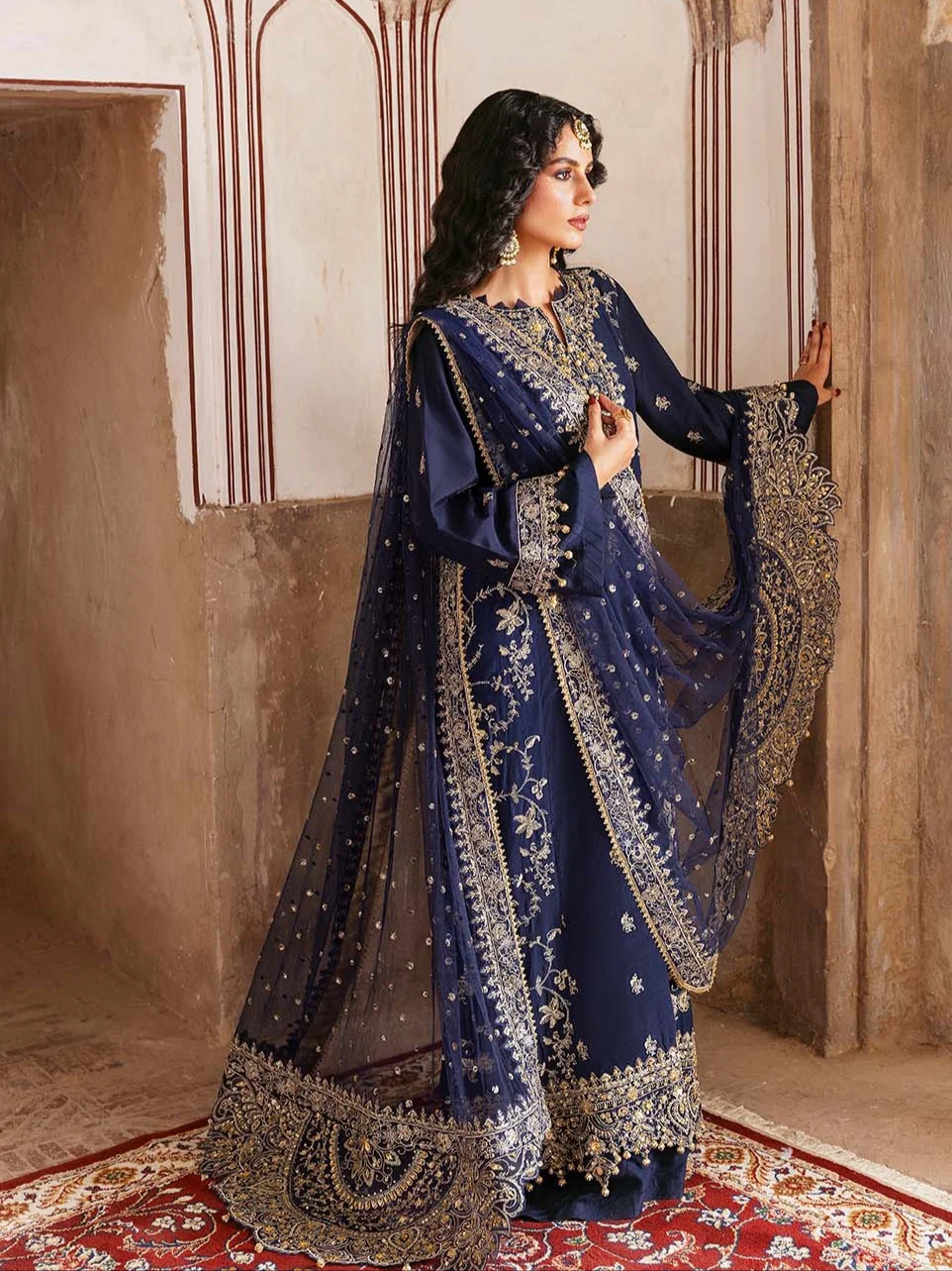 Bathed in the celestial hue of midnight blue, Rūhānī is a masterpiece of devotion and allure. Crafted from luxurious raw silk, the ensemble features intricately sequined embroidery across its center and side panels, composing a gentle symphony of shimmer with every movement. The neckline and daman are hand-embellished with artisanal finesse, echoing the timeless grandeur of Mughal craftsmanship — an ode to elegance that feels both regal and deeply soulful.C
