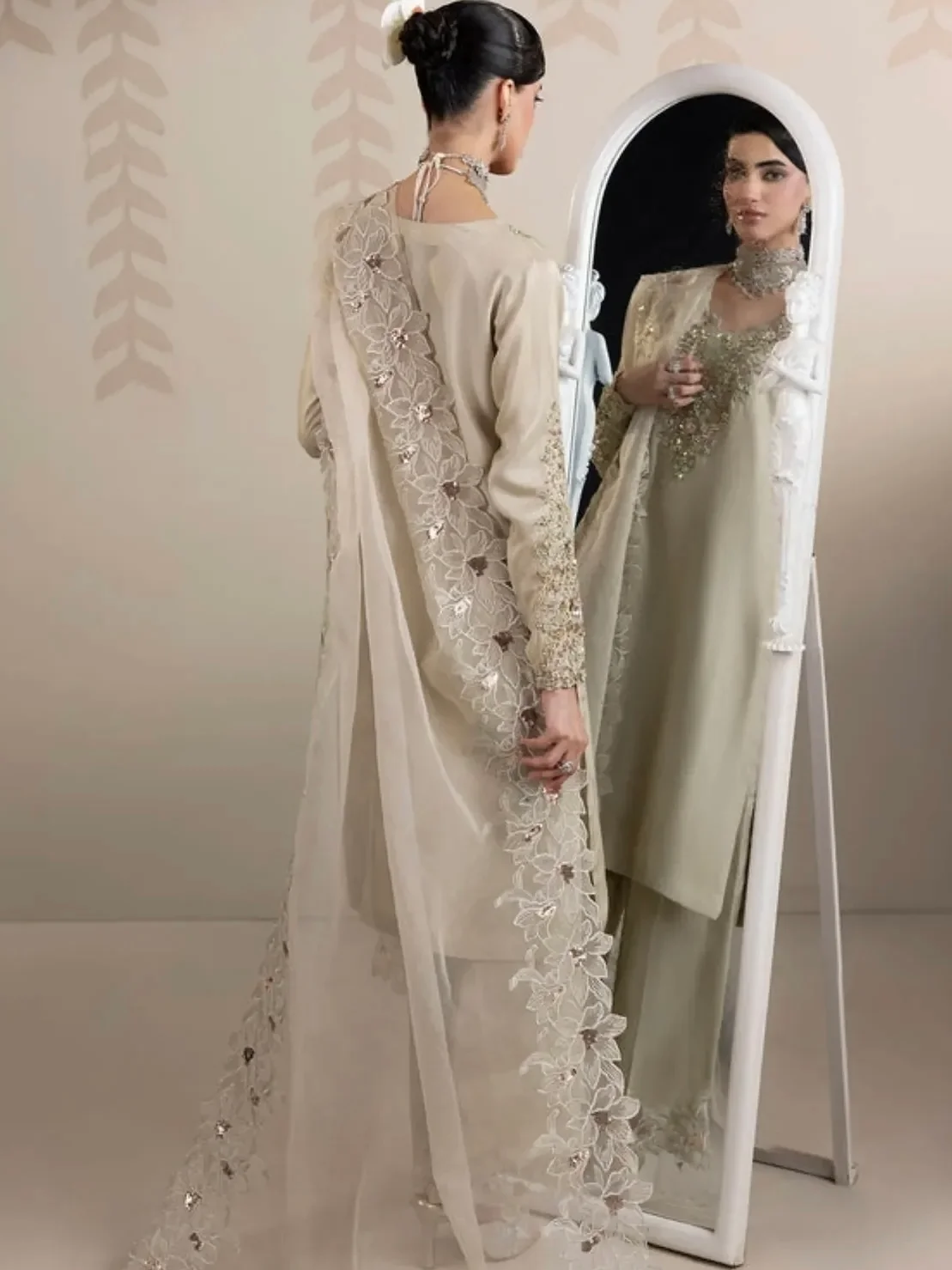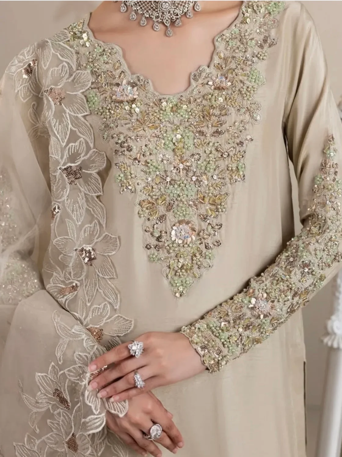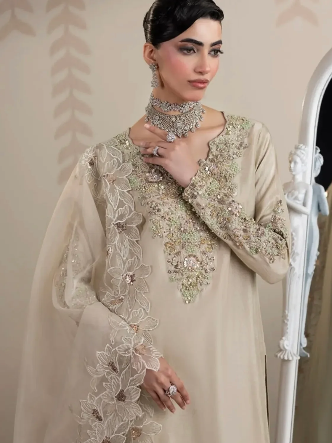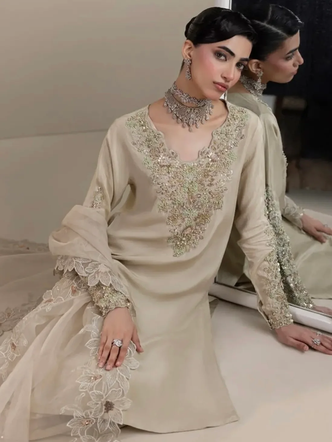 Medium length shirt with straight pants paired with organza duppata, an outfit completes the look with heavy embroidery and embellishment.