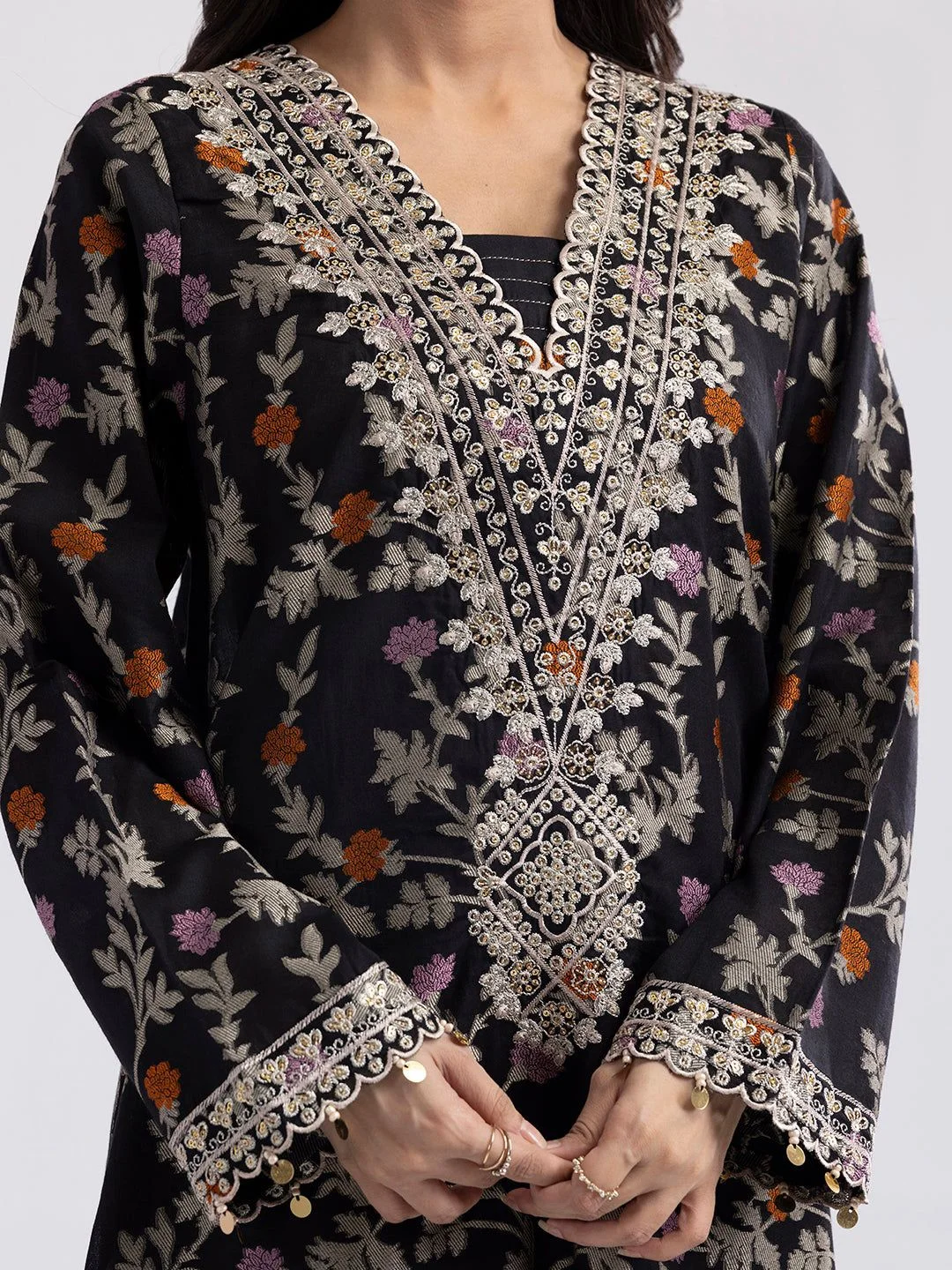 This elegant women’s pret set features a richly embroidered kurta, paired with a matching dupatta and trousers, all crafted from premium jacquard fabric. The black color enhances its sophisticated appeal, making it ideal for formal occasions and stylish everyday wear. The jacquard material ensures durability and a comfortable fit, while the detailed embroidery adds a refined, timeless touch to your wardrobe.
