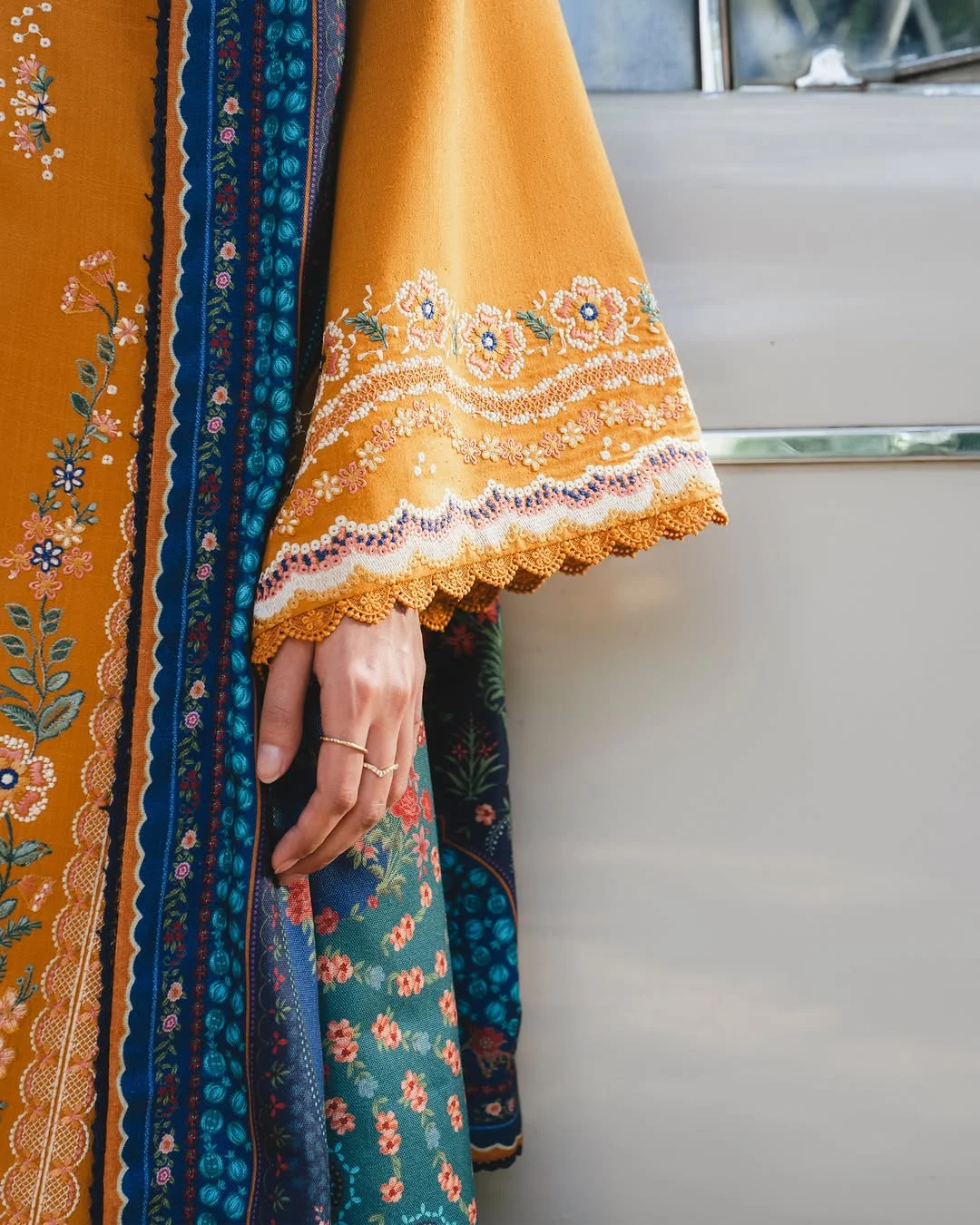 A refined karandi shirt featuring floral satin stitches and subtle schiffli pattern along the hem, complemented by a contrasting blue woolen printed shawl and karandi trouser – effortless sophistication for winter days.